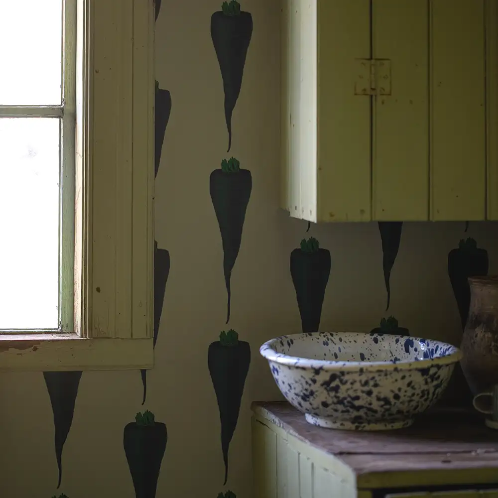 Die Tapete Carey Carot von Lisa Bengtsson ist eine bezaubernde Wahl für Liebhaber des modernen Landhausstils. Mit ihrem einzigartigen Charme und ihrer sympathischen Ausstrahlung zieht sie alle Blicke auf sich. Die Tapete zeigt colorierte Möhren in einem tiefen Grün.