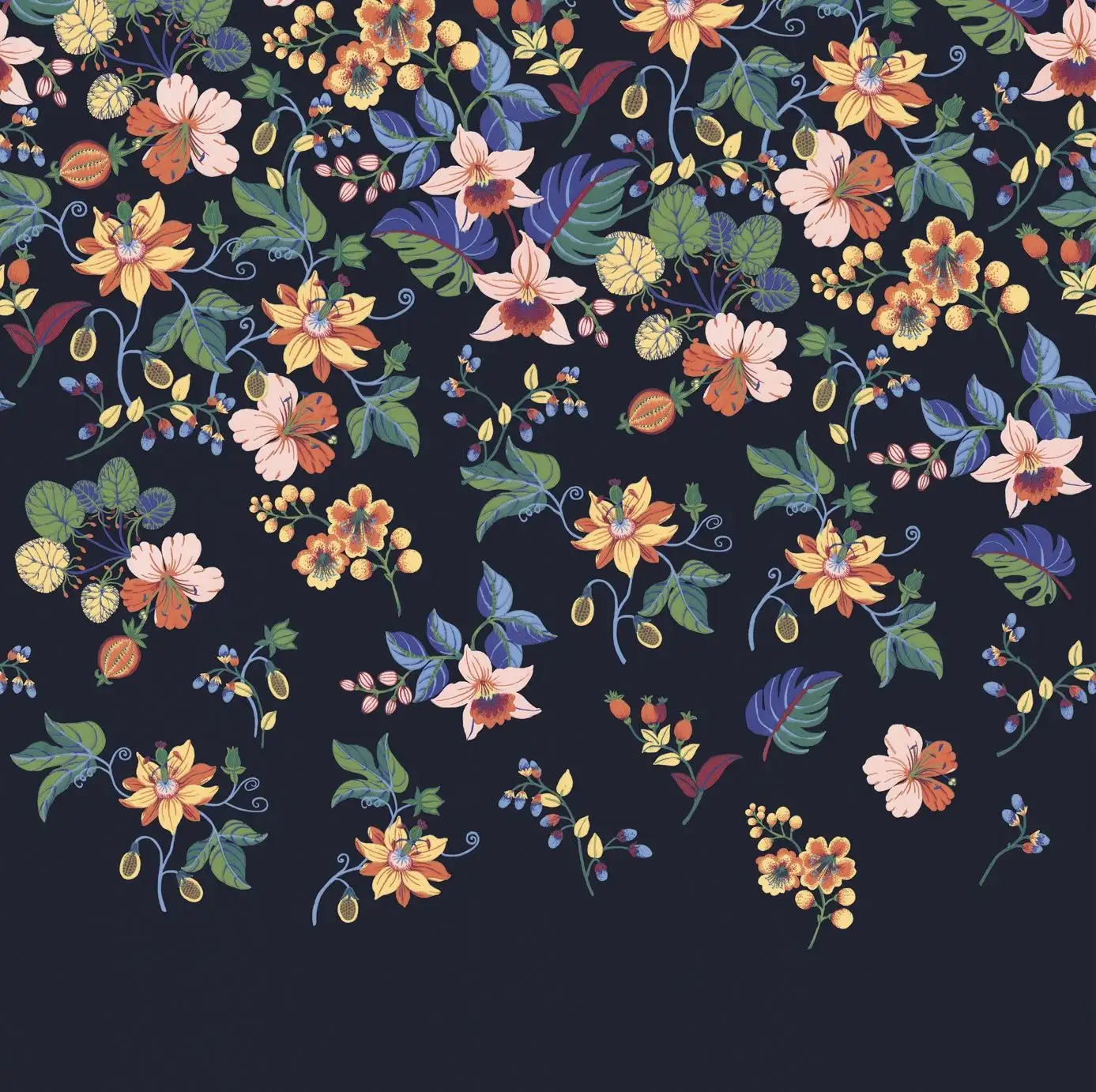 Verwandeln Sie Ihre Wohnräume mit der Tapete Carmen Falls in ein rauschendes Meer aus Blüten. Je nachdem wie Sie diese Tapete verkleben, fallen die farbenprächtigen Blüten direkt von der Decke in wirbelnden Ranken in den Raum hinein, oder sie erzeugen von unten nach oben wachsend den Eindruck einer emporwachsenden exotischen Blumenwiese, deren florale Bewohner ihre Köpfe in Richtung Sonne strecken. Besonders leuchtend und intensiv wirken die Farben der Blumen und Blätter durch den dunklen Untergrund.