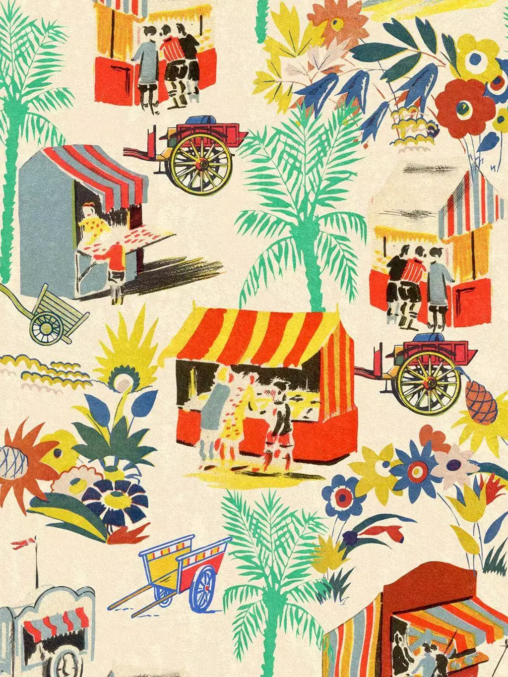 Die Tapete „Carretto del Cibo“ versprüht den Charme italienischer Straßenmärkte und bringt ein Stück südländisches Lebensgefühl in Ihr Zuhause. Mit ihren farbenfrohen Marktständen, Palmen und floralen Elementen erzählt sie Geschichten von fröhlichem Treiben und genussvollen Momenten unter der mediterranen Sonne. Die verspielten Illustrationen und die lebendigen Farben schaffen eine warme und einladende Atmosphäre, die an Urlaubserinnerungen und gesellige Stunden erinnert.