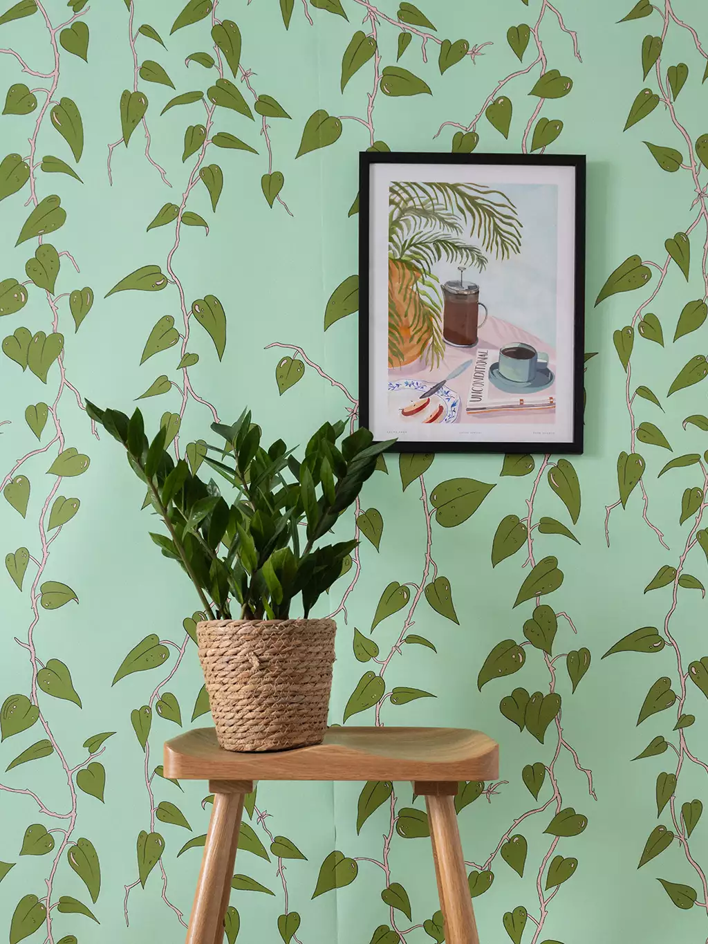 Cascada, inspiriert von Costa Rica, einem Ort, an dem die Natur regiert und die Lebensbedingungen für Pflanzen und Tiere einzigartig sind, bedeutet wörtlich "Wasserfall" auf Spanisch. Die Tapete zeigt das Philodendron-Gewächs und bringt die Freiheit der Natur ins Haus. Die Farbgebung Amazonite wurde durch den Halbedelstein Amazonite inspiriert und lässt sich ideal mit den rosa Ranken & olivegrünen Blättern kombinieren