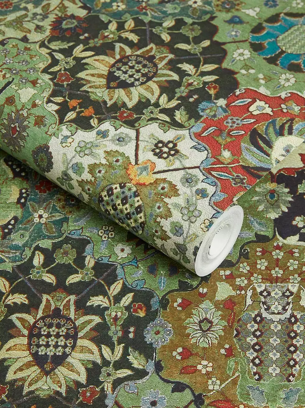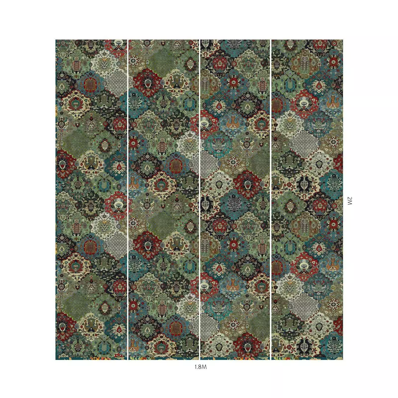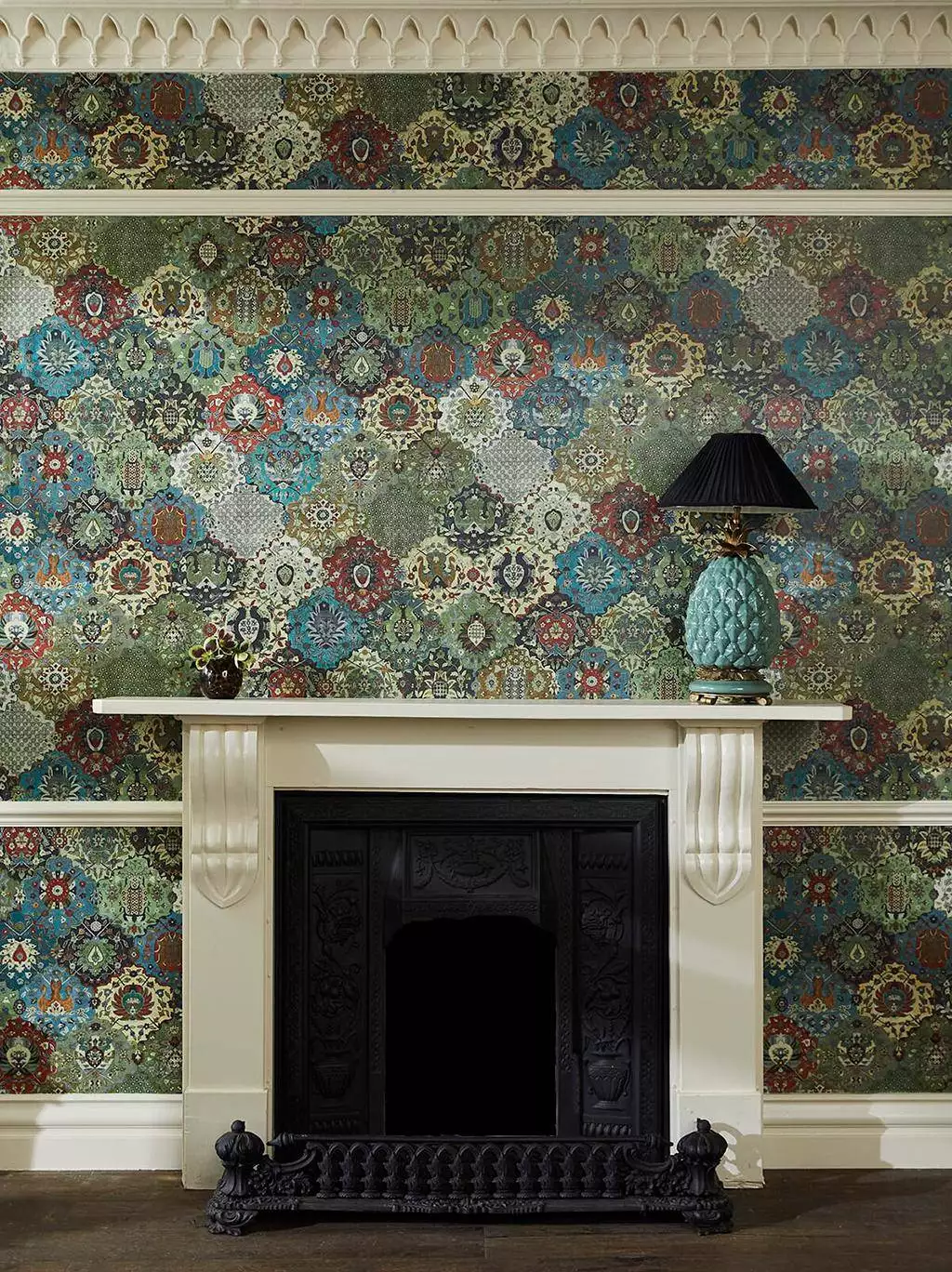 Diese faszinierende Ornament-Tapete von House of Hackney vereint die Eleganz traditioneller Muster mit der Energie moderner Designs. Die farbenfrohe Anordnung von Ornamenten in Rot-, Blau- und Grüntönen erinnert an kunstvolle Mosaike oder orientalische Teppiche und schafft einen Hauch von Exotik in jedem Raum.