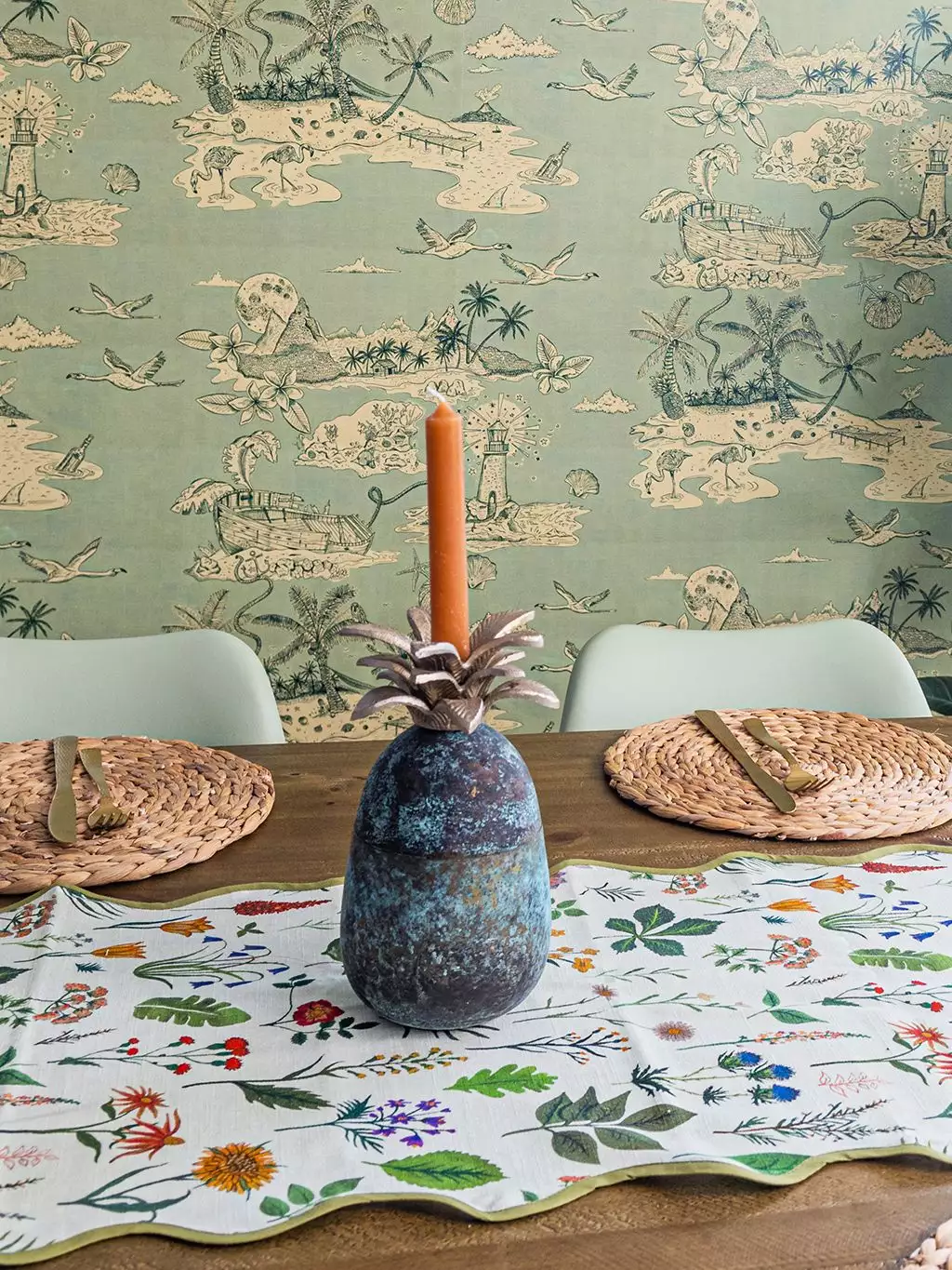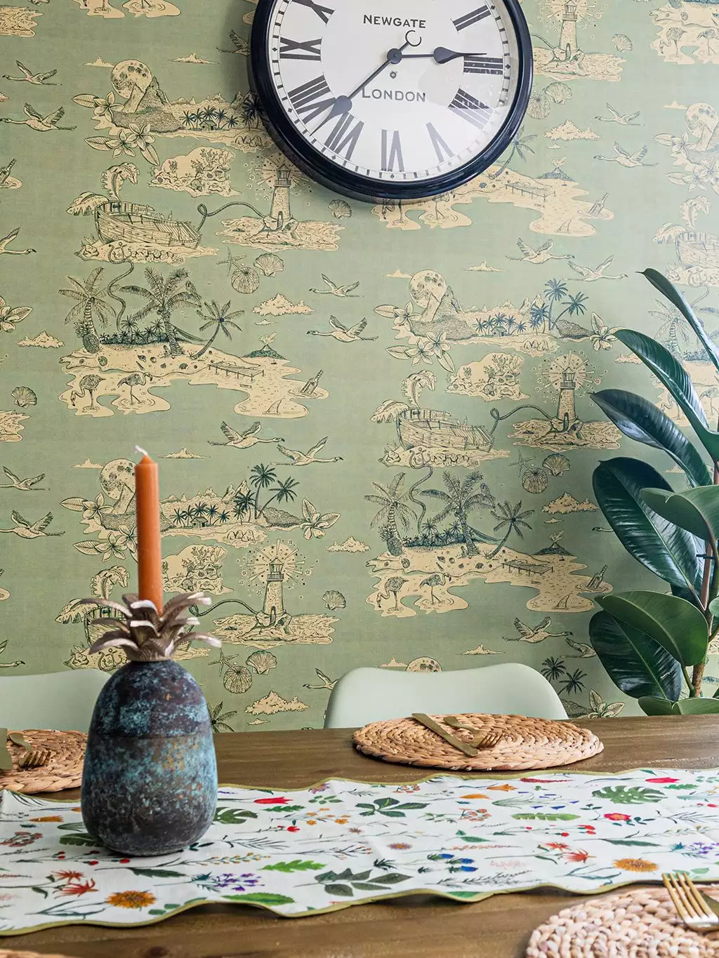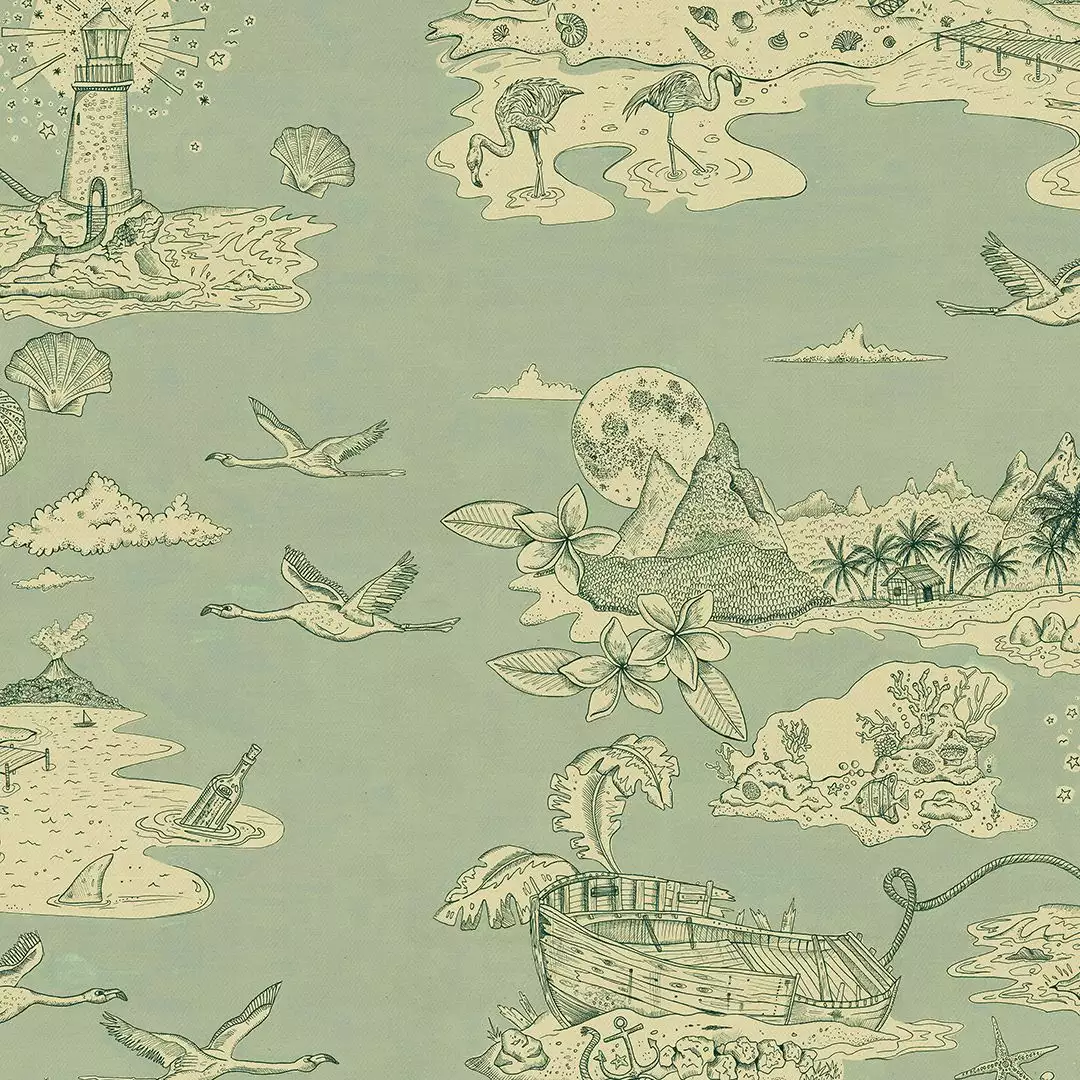 Castaway ist eine moderne Interpretation des traditionellen "Toile de Jouy"-Drucks, der eine paradiesische Landschaft