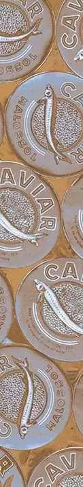Das Bild der Caviar-Dosen entstand während eines Spazierganges durch New York. Es ist ein Ausschnitt aus einem Schaufenster eines kleinen Delikatessladens in SoHo, Manhatten. Das Motiv wiederholt sich, wie bei einem herkömmlichen Tapetendesign, aber doch ist jede Dose anders. Das Bild wurde analog auf einem SW Film belichtet.