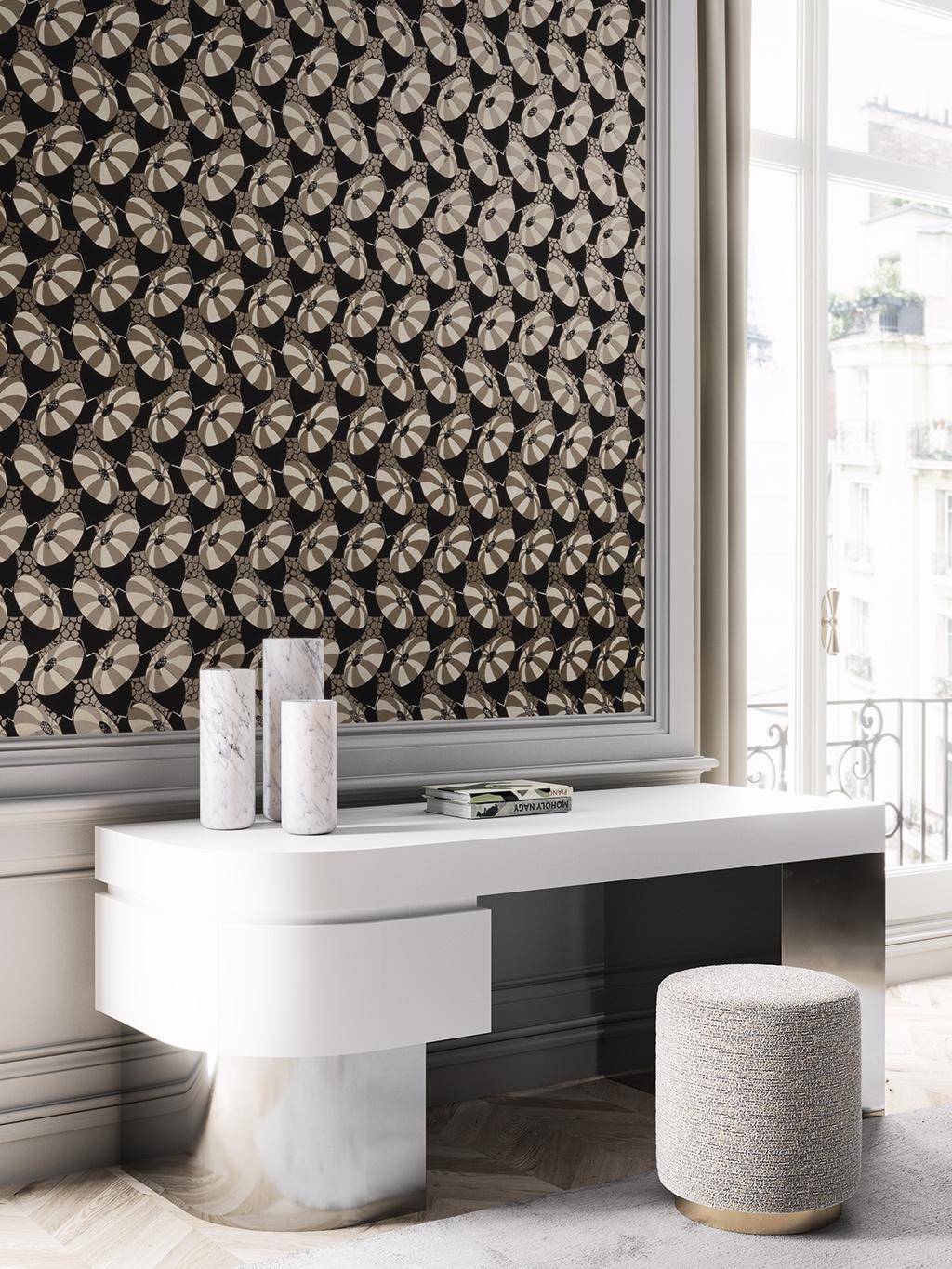 Die Tapete Cecilia Castlerock hat etwas wunderbar Verspieltes: Diese runden, übereinanderliegenden Formen erinnern an kleine Sonnenschirme, daneben treten Blätter und fast kieselartige Elemente auf, die dem Muster etwas Organisches geben. Bronze, Silber, Creme und Schwarz schaffen eine lebendige, leicht glamouröse Art-Déco-Stimmung. Die Tapete wirkt nicht schüchtern, eher selbstbewusst dekorativ und bringt genau die Art von Persönlichkeit in einen Raum, die man nicht erklären muss. Man spürt sie.