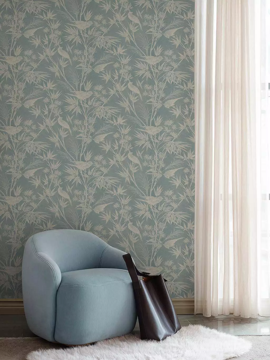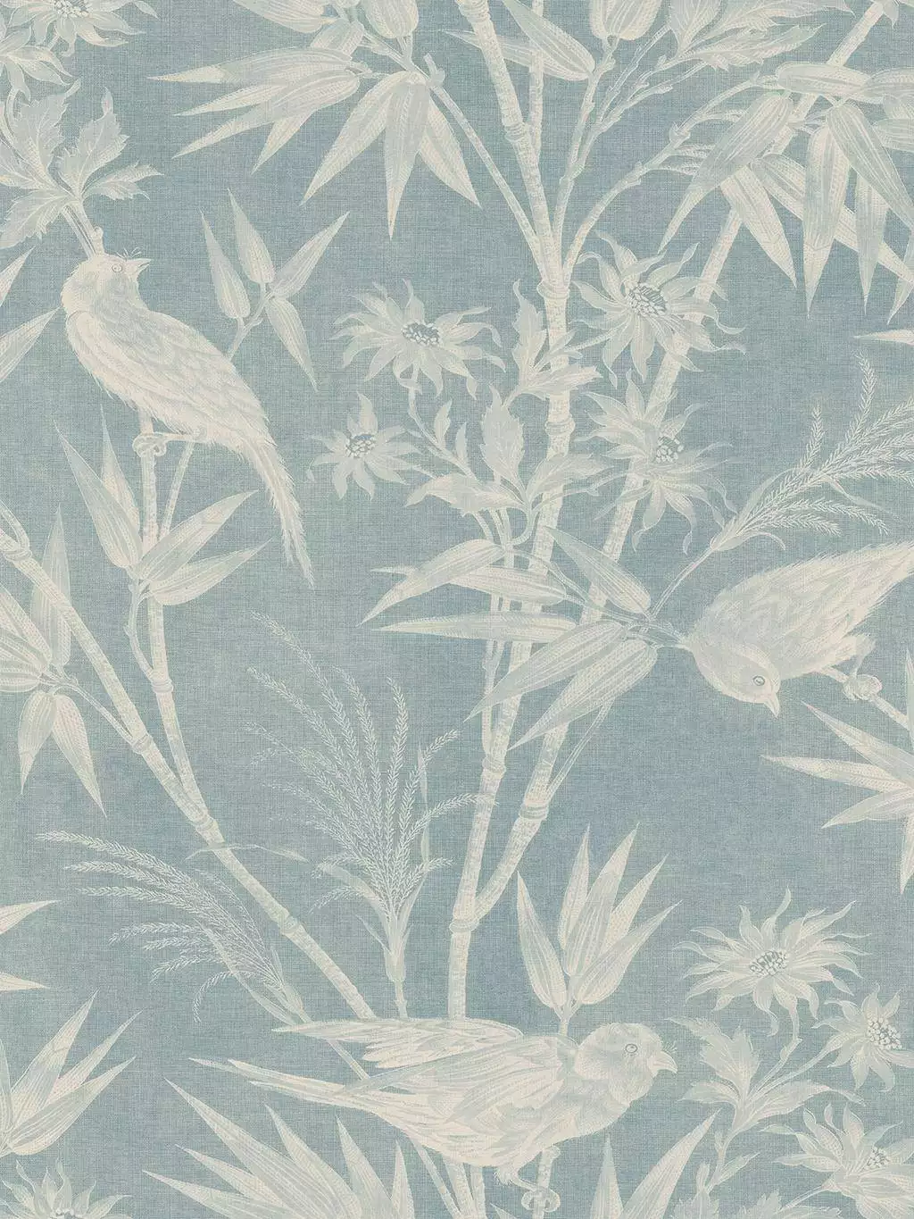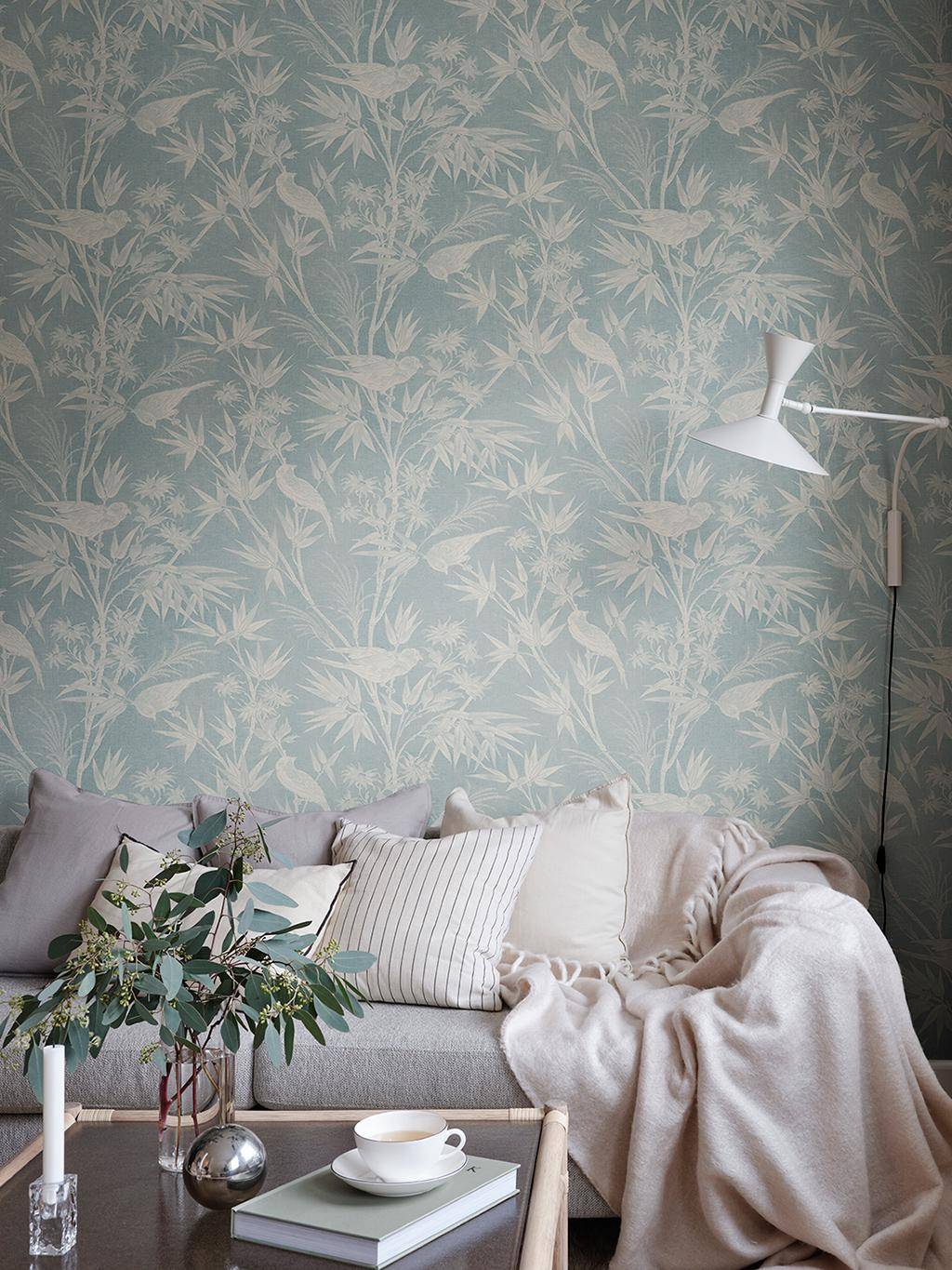 Die Tapete Celeste Misty Blue lebt von einem klaren skandinavischen Blau, das Ruhe ausstrahlt, ohne kühl zu wirken. Das Toile-Motiv mit Vögeln und verschiedem Laubwerk bleibt bewusst zurückgenommen und gleichmäßig geführt, sodass keine einzelne Szene dominiert. Die gedruckte Oberfläche erinnert an eine textile Struktur, die dem Muster Substanz verleiht und es erdet. Celeste ist sanft, aber nicht lieblich – eine Tapete mit stiller Präsenz, die Räume ruhig trägt und Tiefe schafft. Aus der Kollektion Familjen.