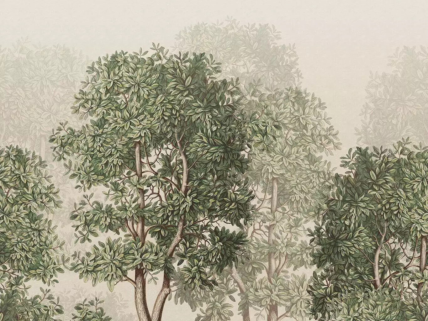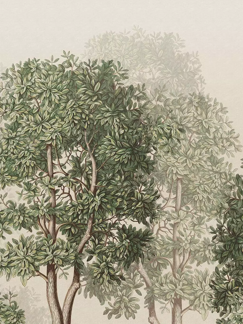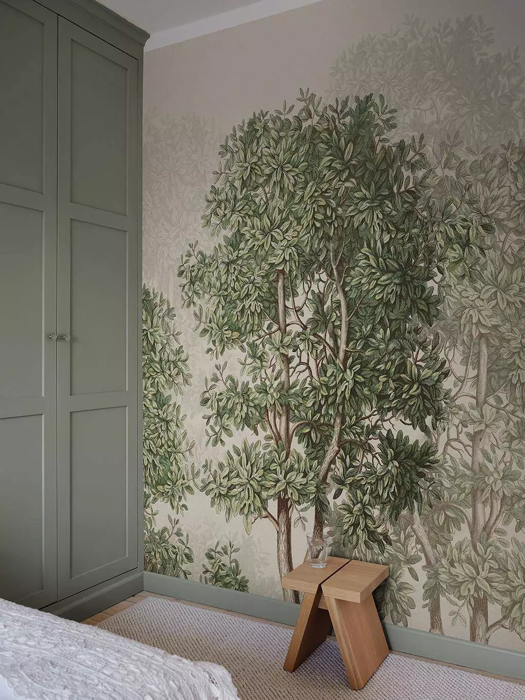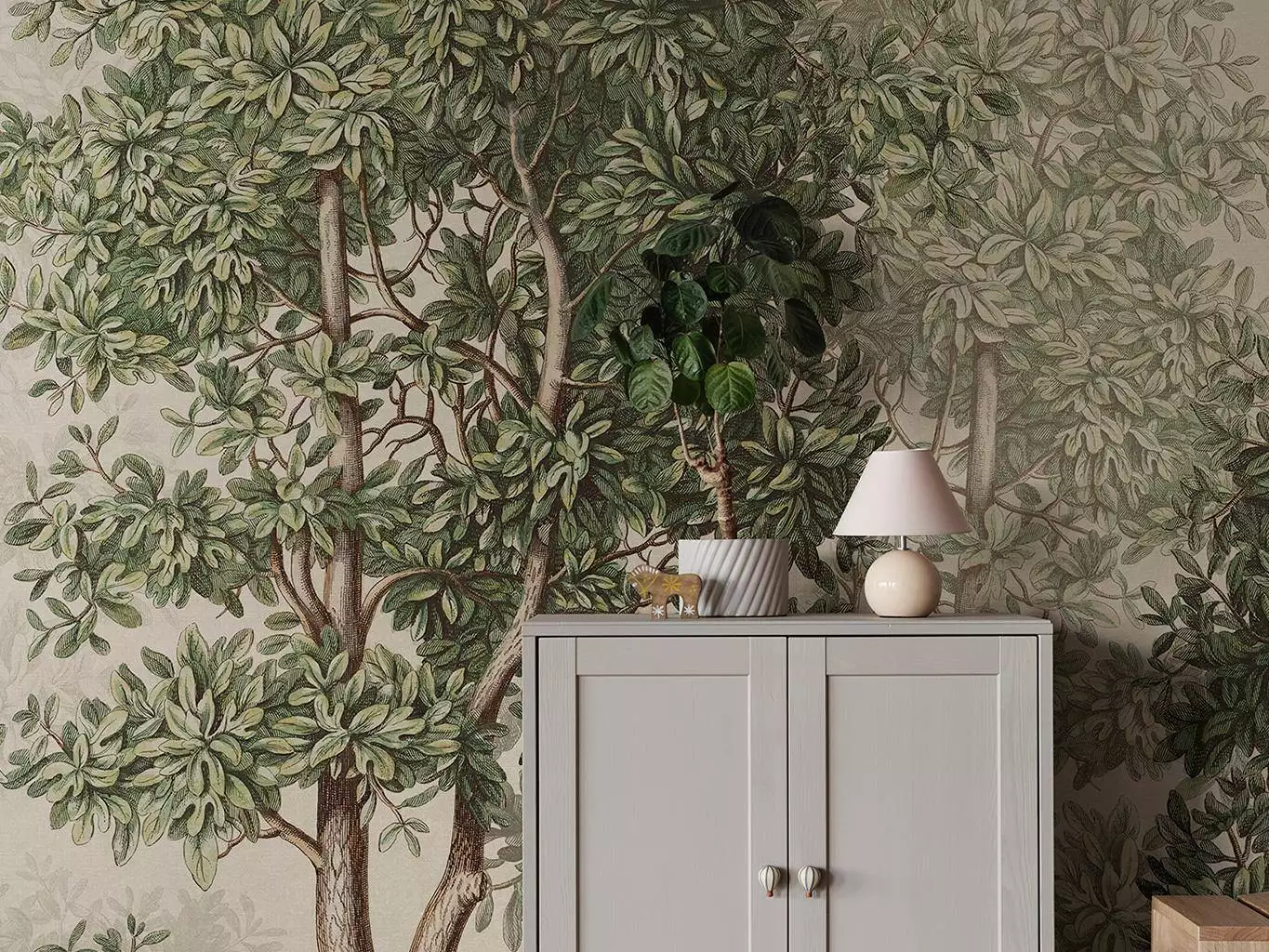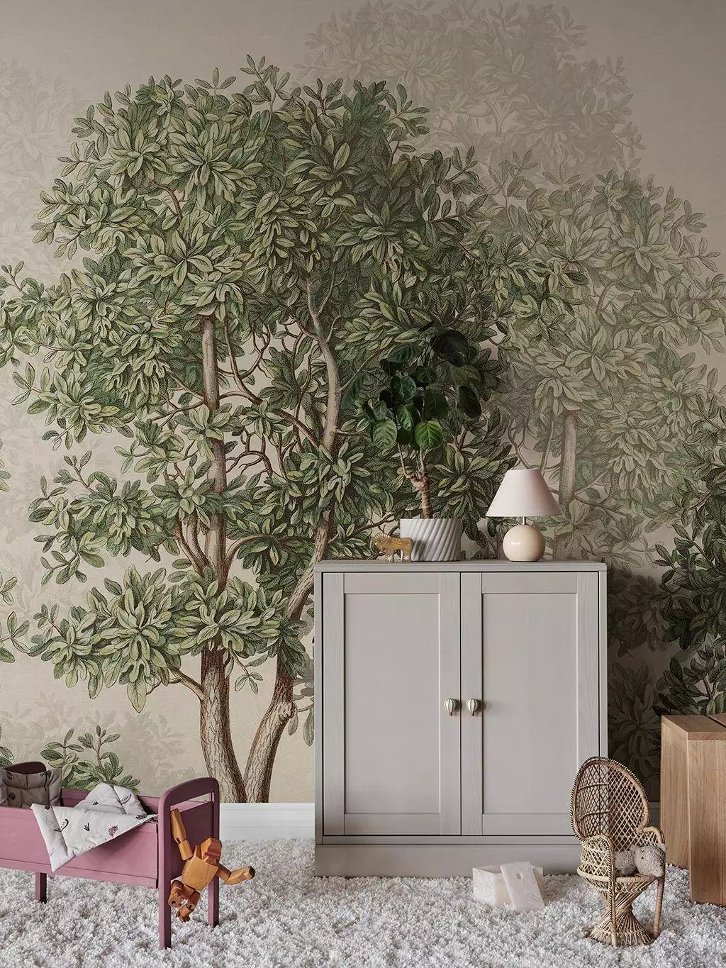Das Wandbild Charles ist wie ein Spaziergang durch einen alten Garten: Die Bäume ruhen, Licht bricht hier und da durch sattgrüne Kronen. Das Motiv umfängt den Raum mit Ruhe und natürlicher Präsenz – zeitlos, geerdet, fast atmend. Man meint, die Luft werde etwas kühler und ein leises Rascheln gehe zwischen den Ästen, als hätte der Raum ein eigenes Tempo gefunden. Das Grün wirkt still, gesammelt und wohltuend entschleunigend. Perfekt für Landhaus Flure.