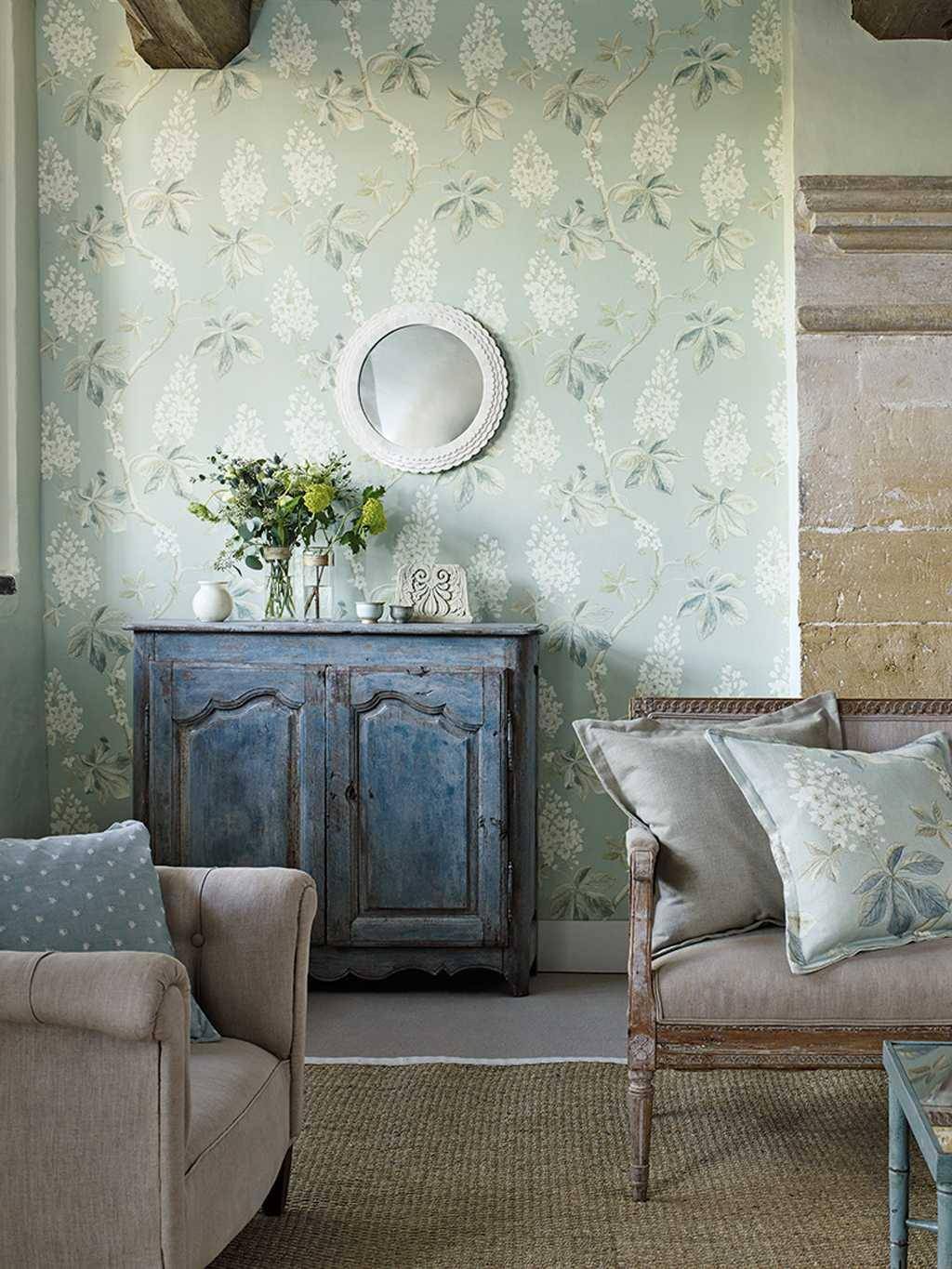 Zarte Kastanienblüten und fein gezeichnete Blätter auf einem hellblauen Grund. Chestnut Tree bringt klassische Naturmotive mit sanfter Farbigkeit zusammen – ruhig, wohnlich und harmonisch.