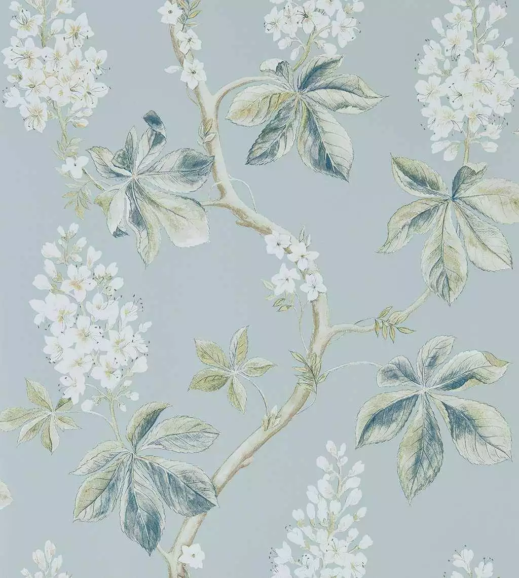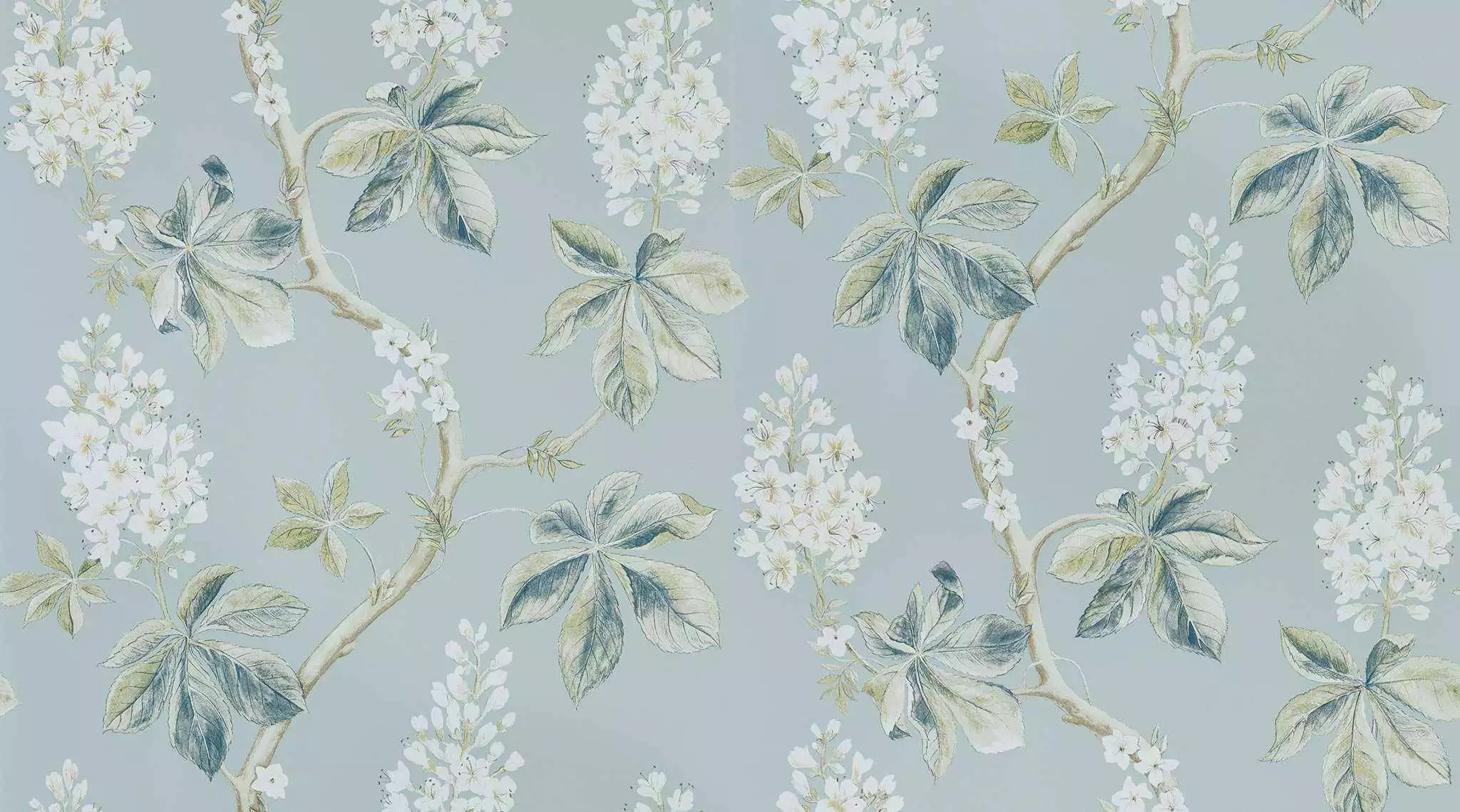 Zarte Kastanienblüten und fein gezeichnete Blätter auf einem hellblauen Grund. Chestnut Tree bringt klassische Naturmotive mit sanfter Farbigkeit zusammen – ruhig, wohnlich und harmonisch.