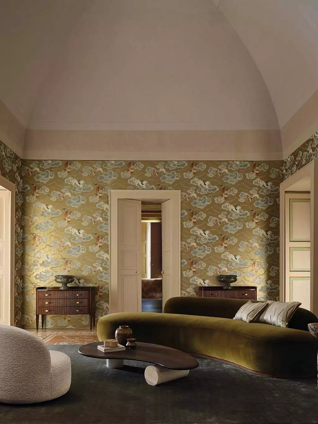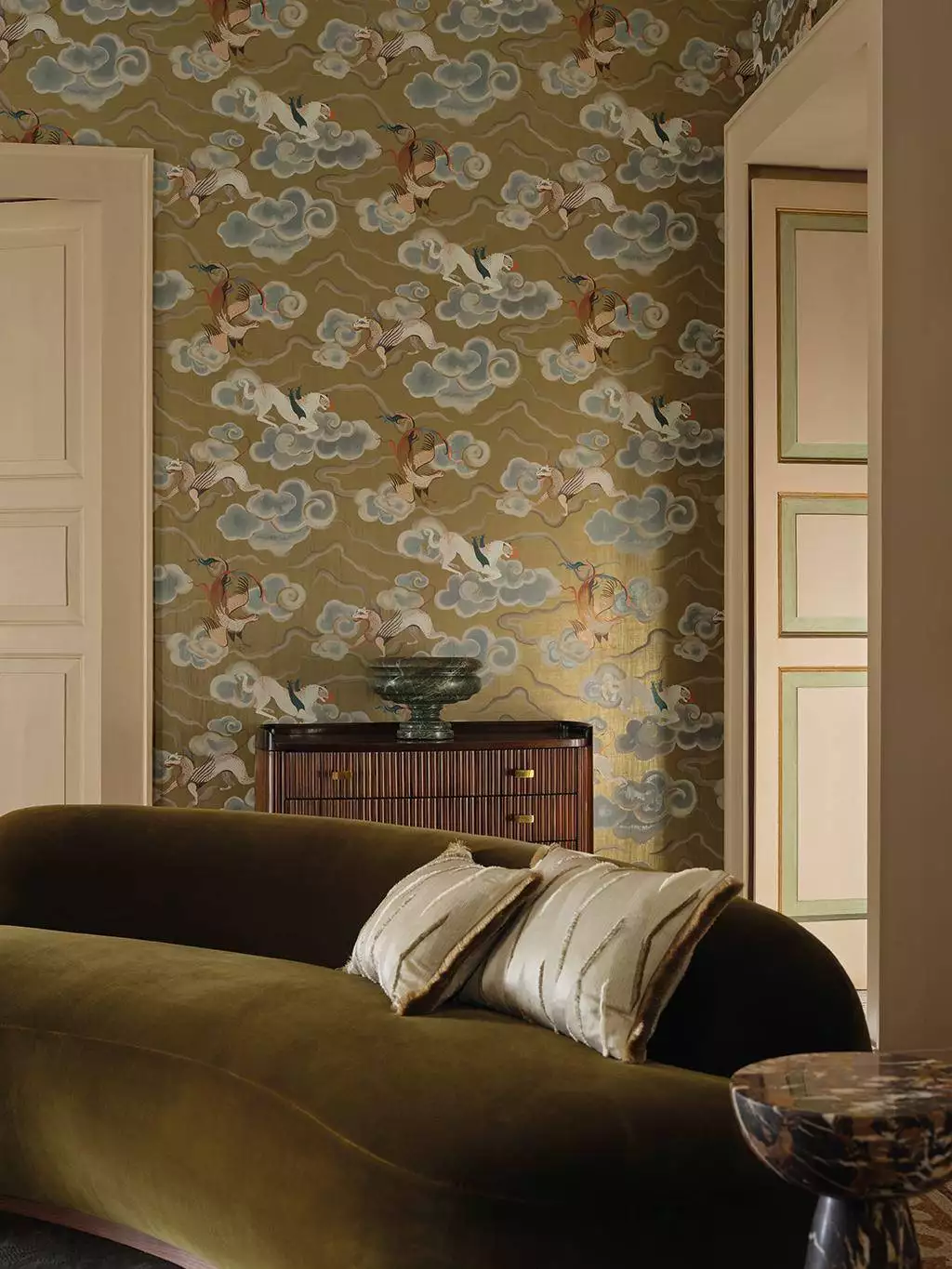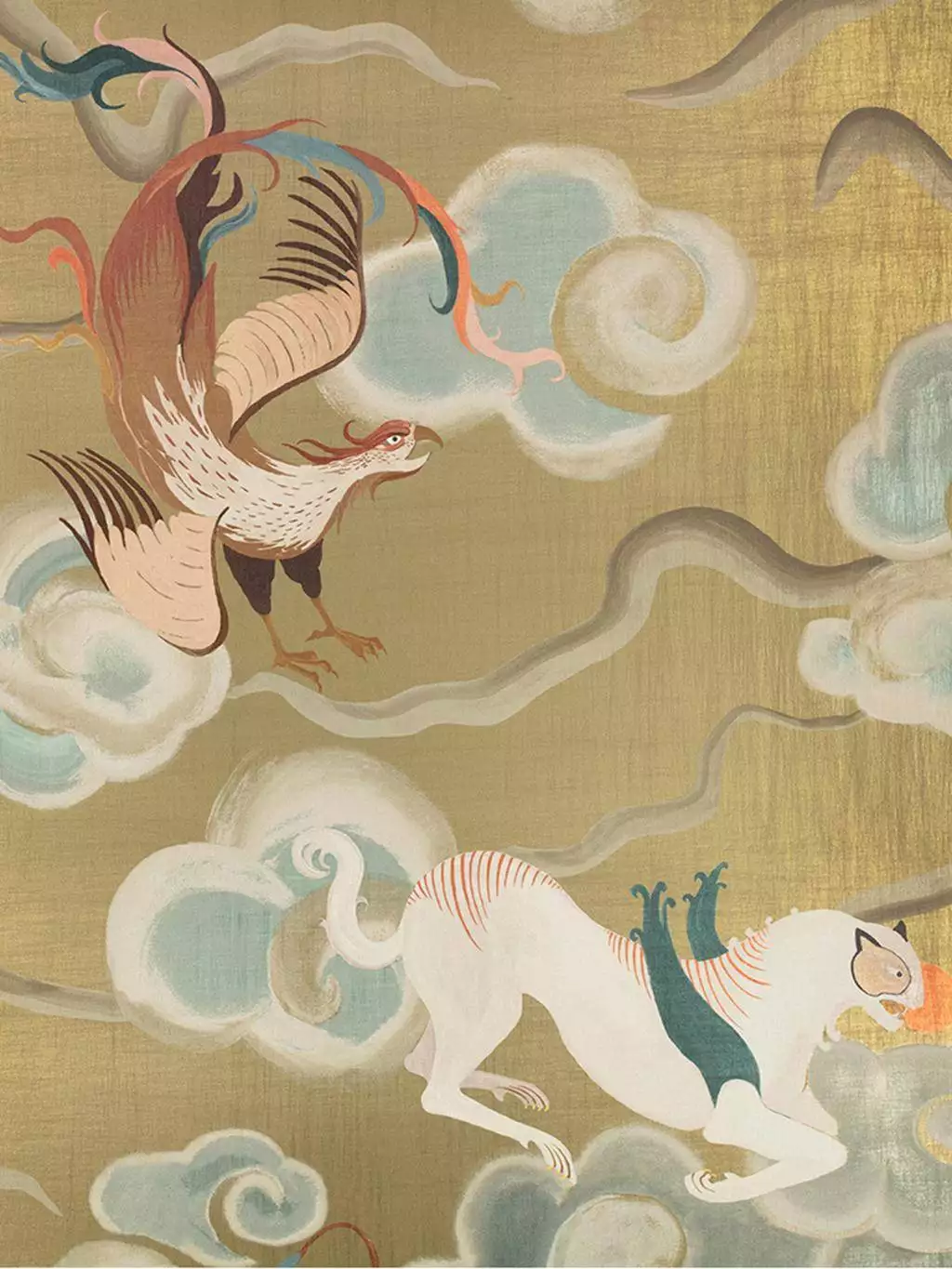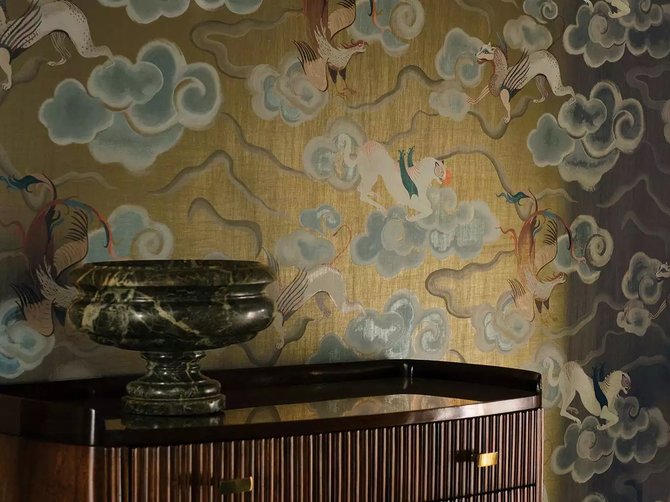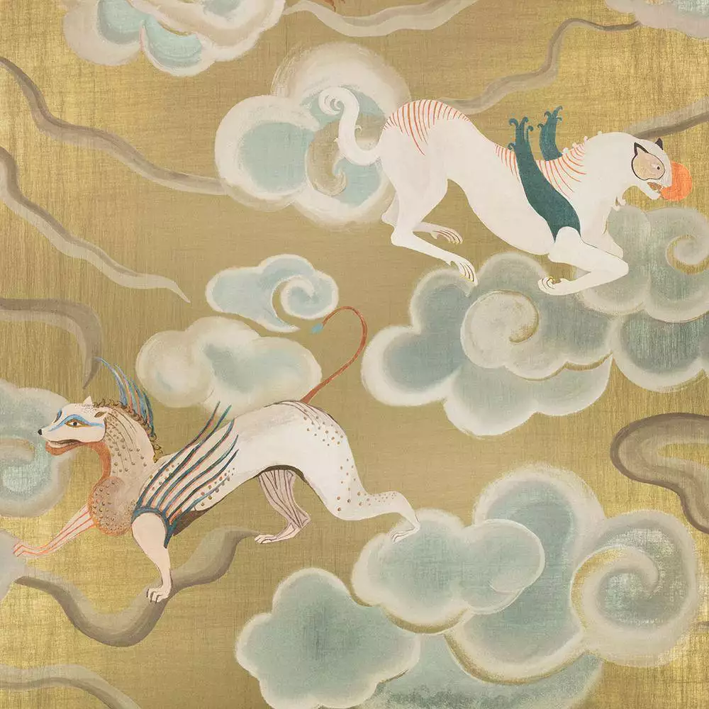 Chimera ist ein eindrucksvolles, ruhiges, flächiges Wandmotiv - reduziert, nicht narrativ, sondern auf die Raumwirkung ausgerichtet. Es zeigt eine Reihe fantastischer, geflügelter Wesen, inspiriert von antiker Mythologie, die mit majestätischer Präsenz über einen luxuriösen, seidenartig schimmernden Grund gleiten. Ätherische Wolken verleihen dem Motiv eine traumhafte Weichheit und Tiefe. In einer bezaubernden Farbpalette aus glänzenden Metallic-Tönen mit kunstvoller Patina entfaltet diese opulente Tapete eine faszinierende, dekadente Ausstrahlung und eignet sich für großzügige, klar gefasste Wandflächen.