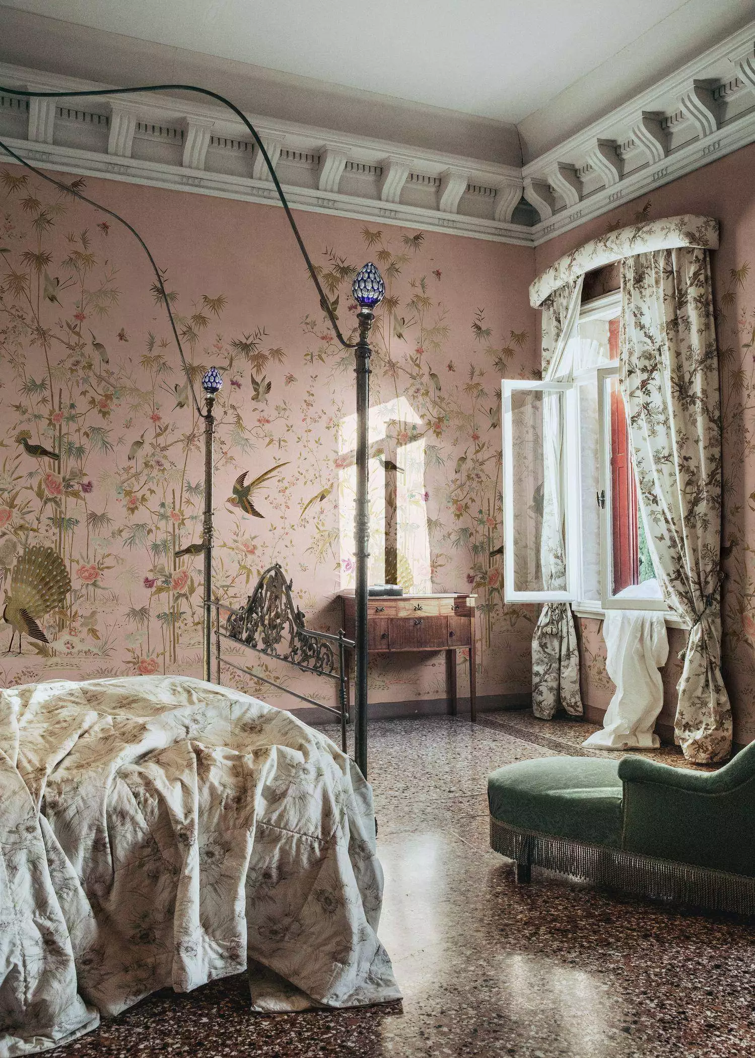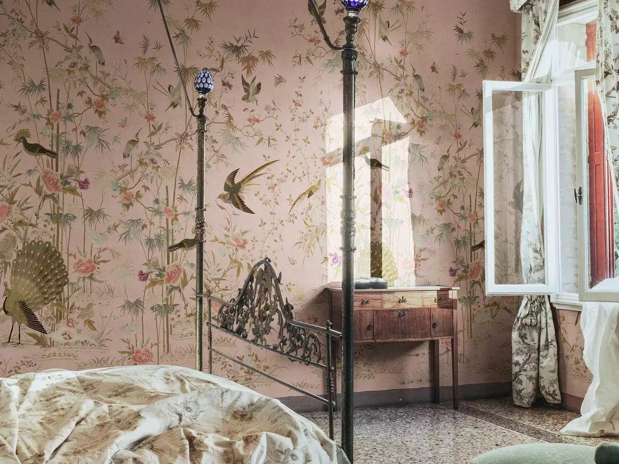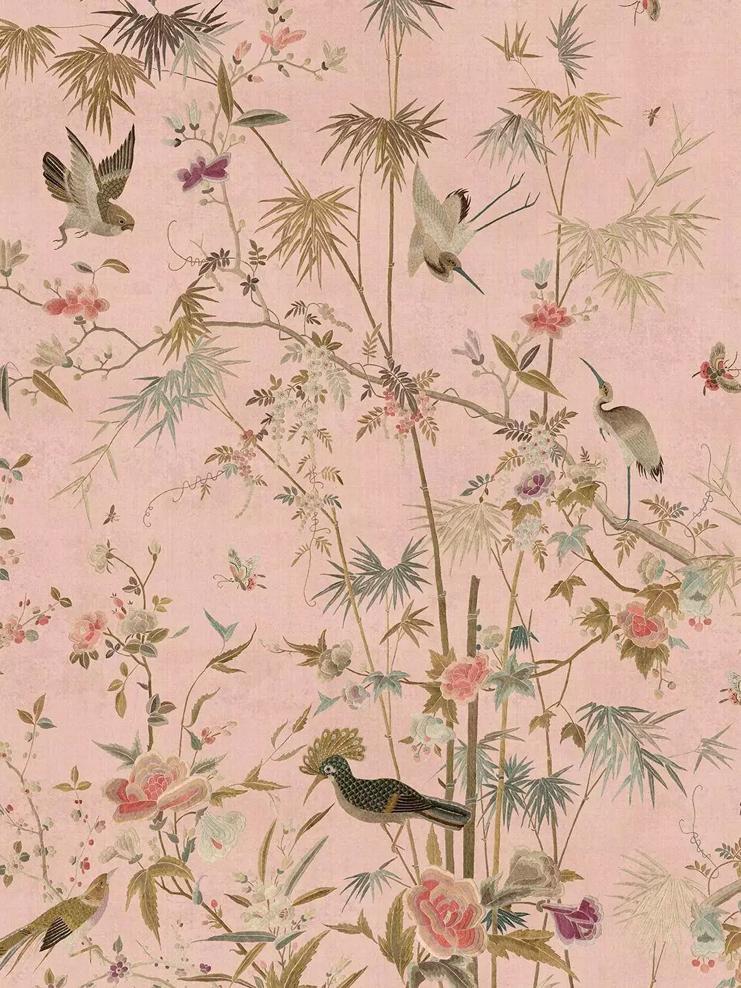 Als Vorlage für diese Tapete dient eine Seidenstickerei aus dem späten 19. Jahrhundert aus Kanton, China, mit exotischen Pflanzen und prächtigen Vögeln und Insekten. Diese Wandmalerei verwandelt jeden Raum in einen wunderschönen Salon.