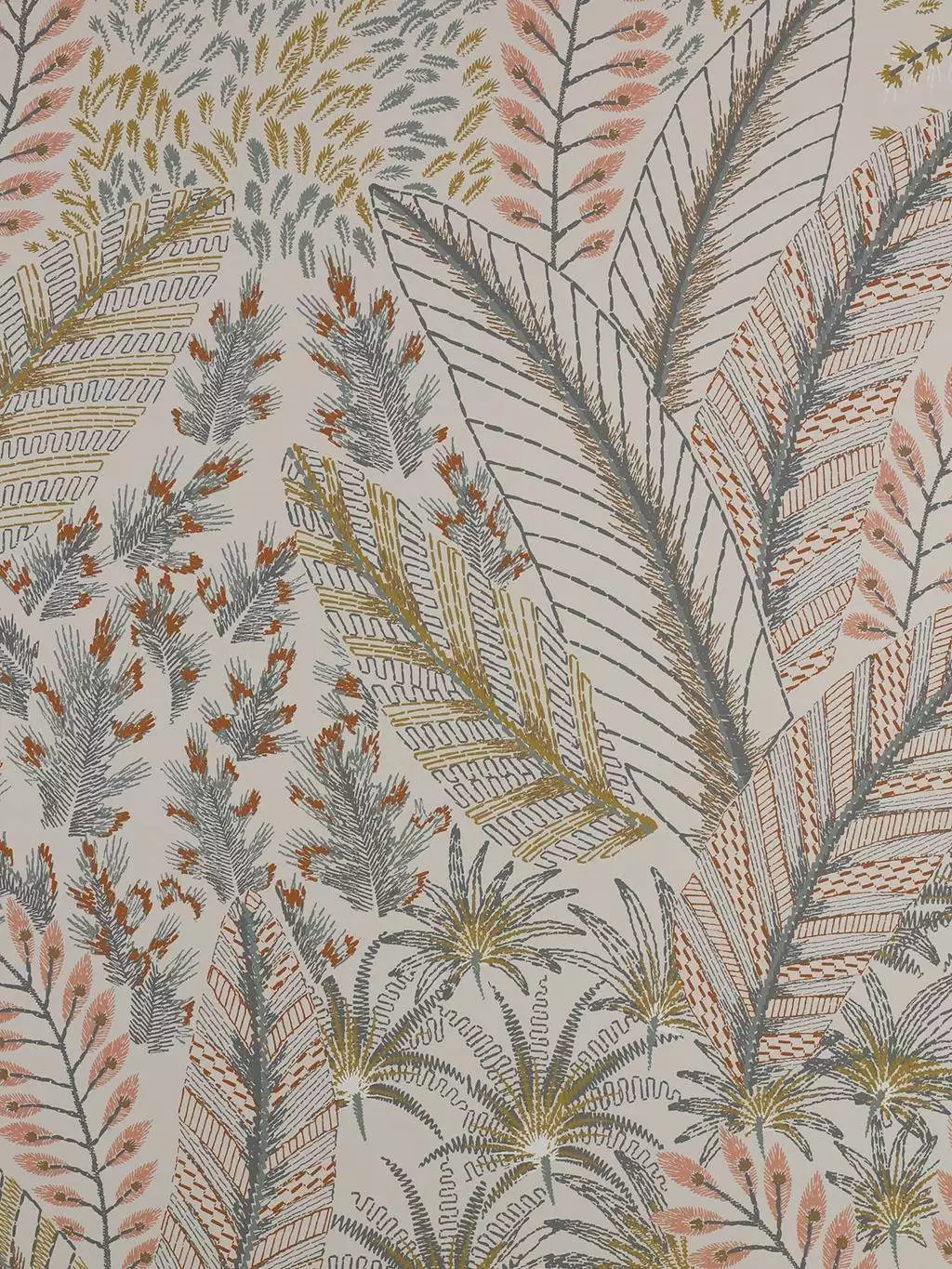 Chiraco erweckt Assoziationen an ein tropisches Gewächshaus mit einem floralen Muster in zurückhaltenden Farbtönen und feinen Zeichnungen.