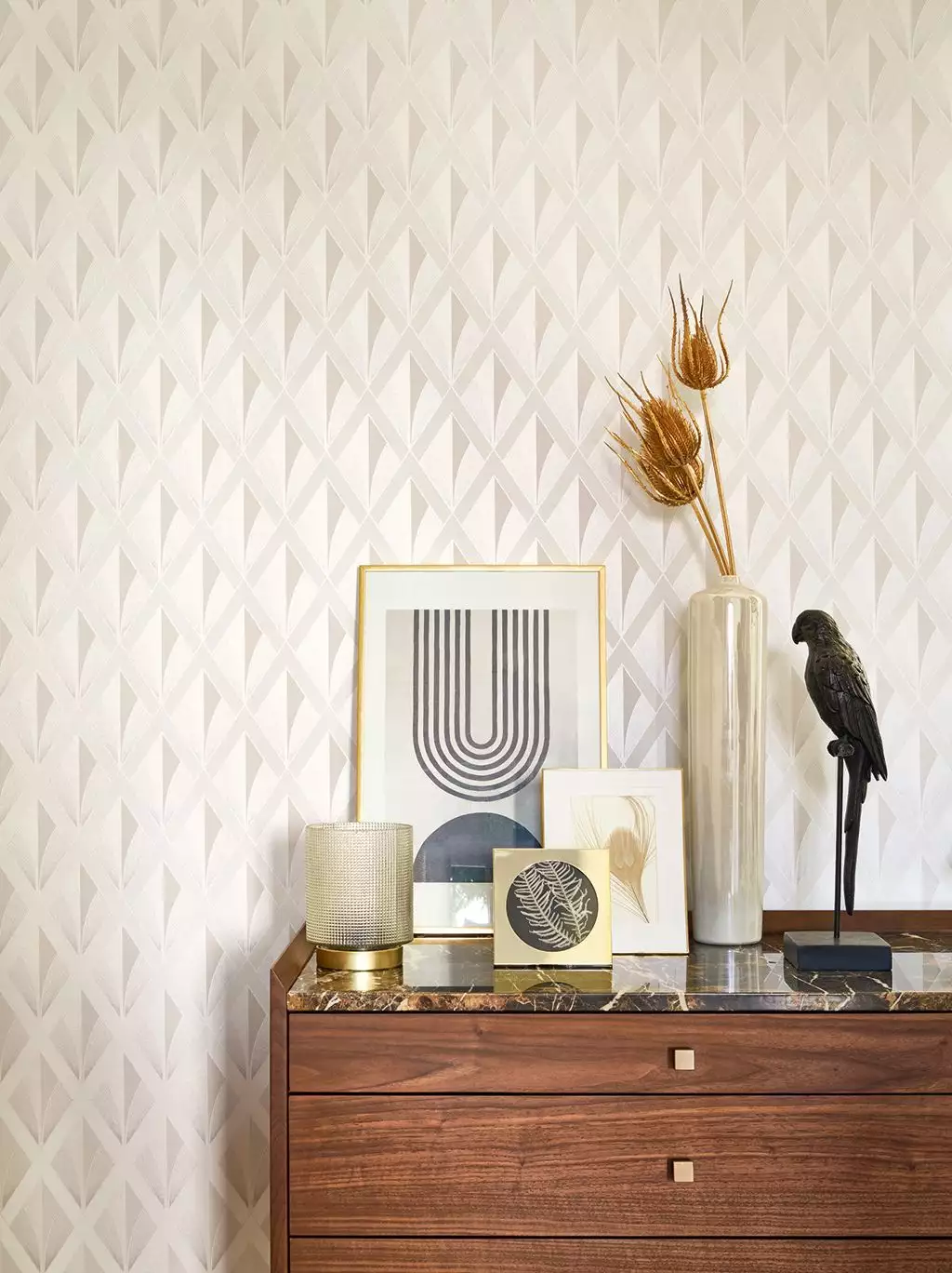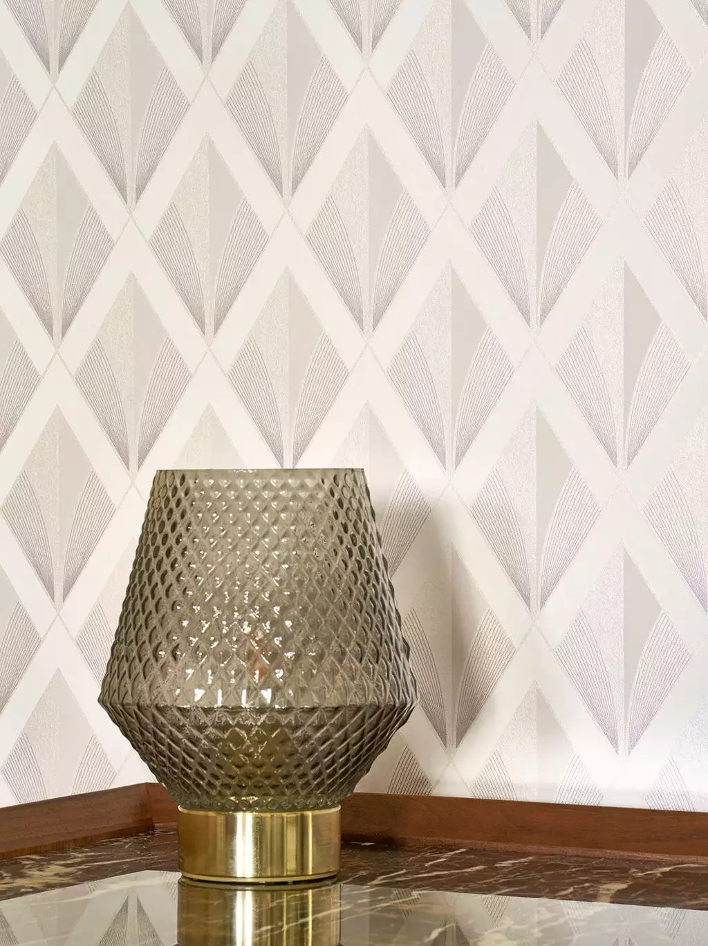 Die Tapete "Chrysler" ist perfekt für alle, die das Besondere lieben und ihrem Zuhause einen Hauch von Nostalgie verleihen möchten. Das klassische Muster erinnert an die glamourösen Zeiten der 20er Jahre und gibt deinem Wohnraum einen edlen Touch. Das dezente Farbspiel in Beige und Silber harmoniert hervorragend mit modernen Möbeln und lässt sich vielseitig kombinieren.