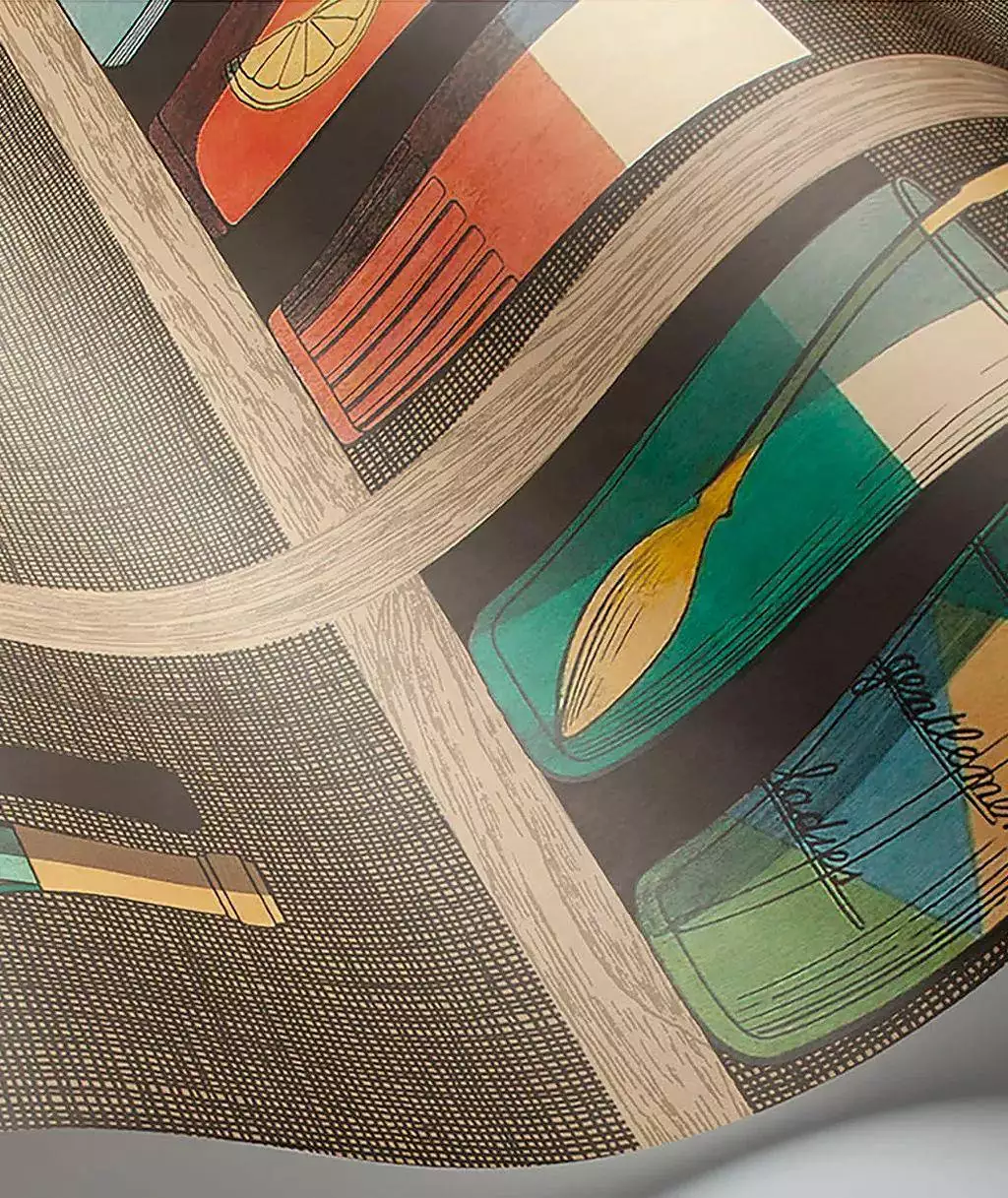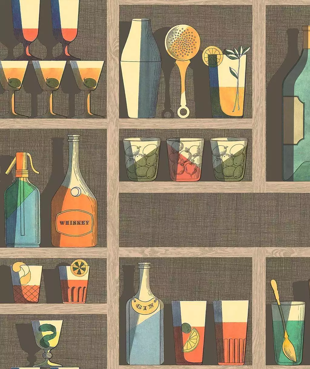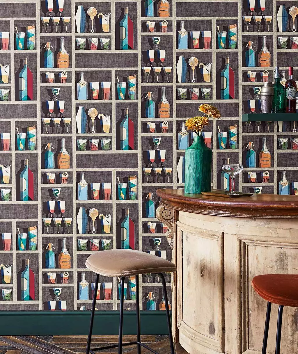 Piero Fornasettis Tapete fügt nicht nur Kunst an die Wand, sondern kreiert auch den visuellen Effekt eines Cocktailregals. Clever gestaltet, lassen stilisierte Cocktails auf der Wand lebendig erscheinen und verleihen dem Raum eine spielerische Atmosphäre.