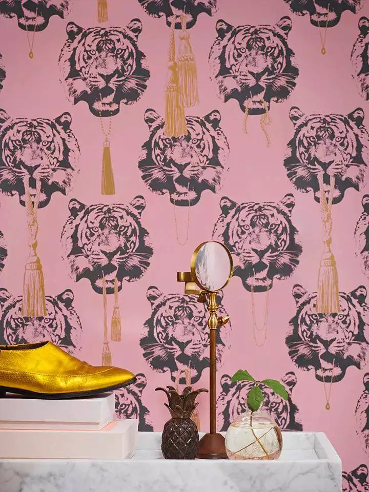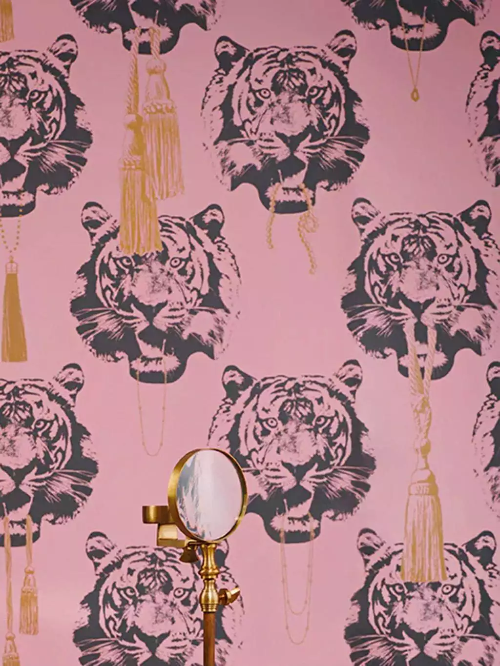 Coco Tiger von Lisa Bengtsson ist ein extravagantes Pop-Art-Statement mit eine Prise Humor. Auf altosafarbenem Grund blicken markante Tigerköpfe in den Raum – im Maul goldene Quasten und feine Ketten. Das Muster verbindet Wildheit mit Glamour und schafft einen auffälligen, stilvollen Kontrast. Außergewöhnlich und verspielt zugleich, zieht die Tapete sofort alle Blicke auf sich. Ideal nicht nur fürs Jugendzimmer, sondern durchaus auch für moderne Wohnräume und trendige Bars – sie macht jeden Raum unverwechselbar. Mit ihrem mutigen Design steht der Hingucker Coco Tiger für Individualität und kreative Wohnkultur mit Augenzwinkern.