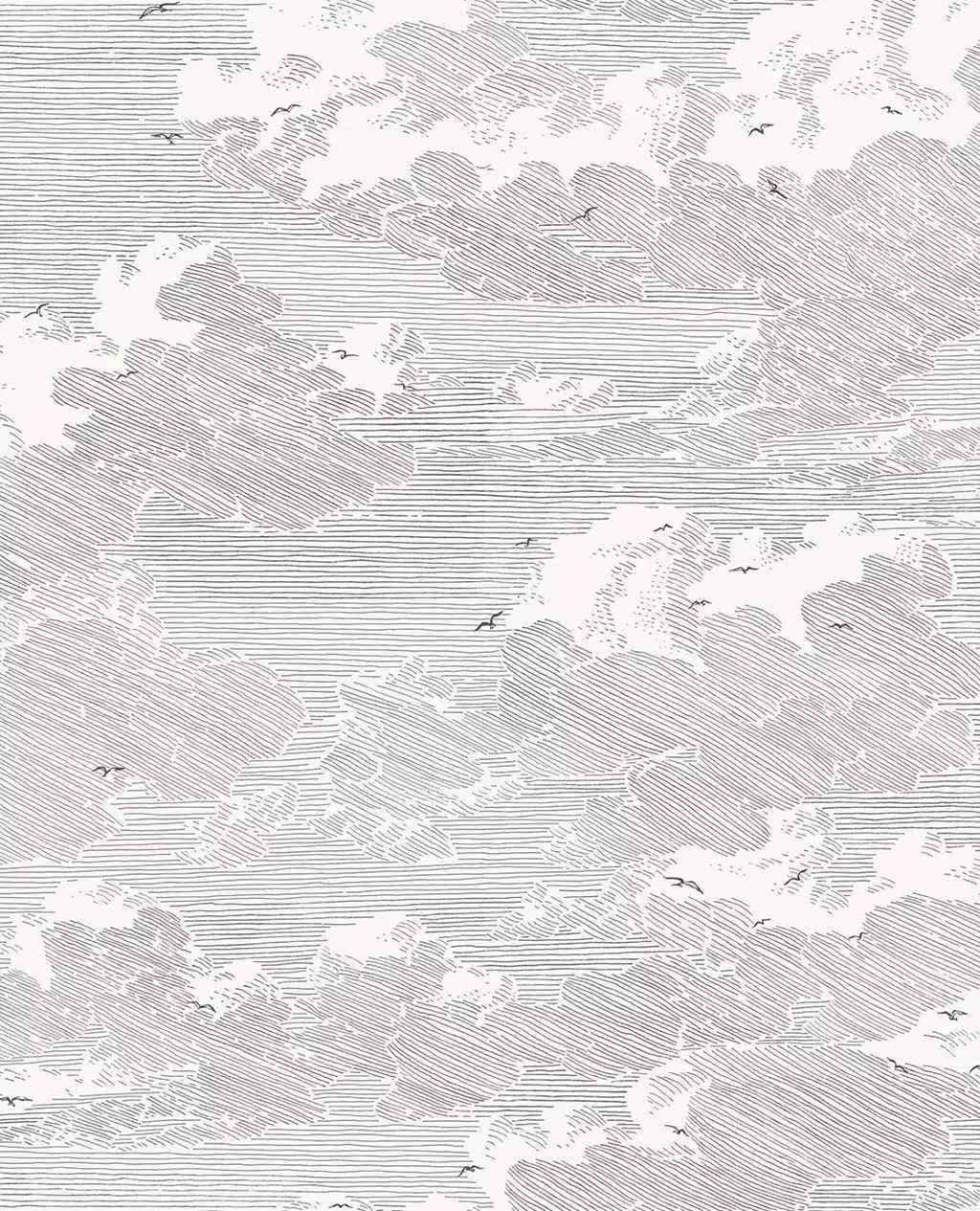 Wie ein Blick in den endlosen Himmel: sanfte Wolkenformationen ziehen über die Wand, durchzogen von feinen Linien. Kleine Möwen verstärken das Gefühl von Weite und Leichtigkeit. Eine Tapete, die Ruhe schenkt und Räume wie Horizonte öffnet.