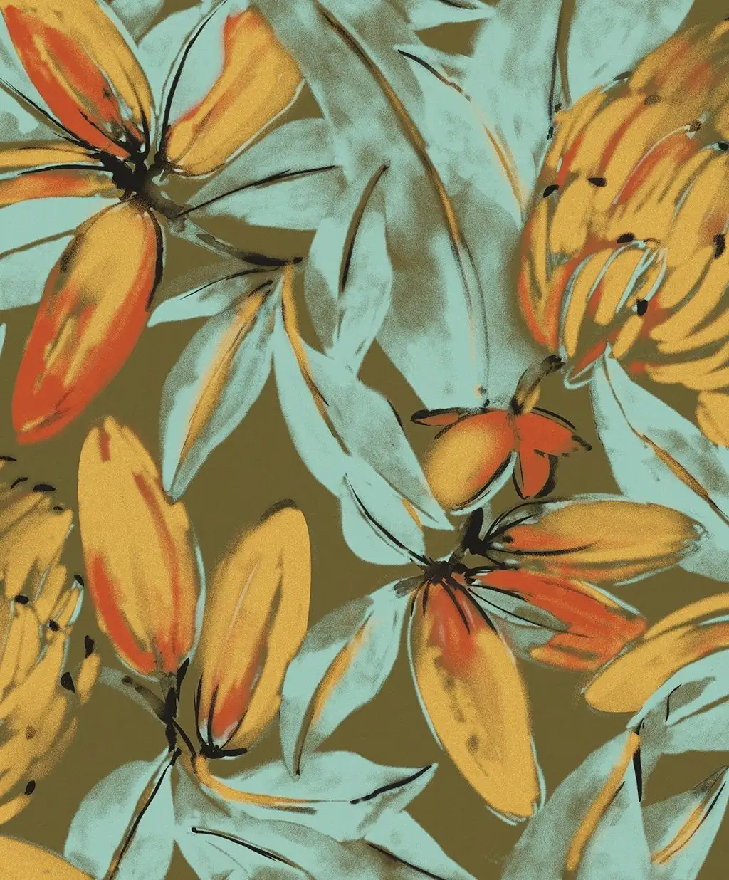 • Großformatige Muster, warme Farben und dezente Metallic-Effekte, die Tiefe und Eleganz schaffen