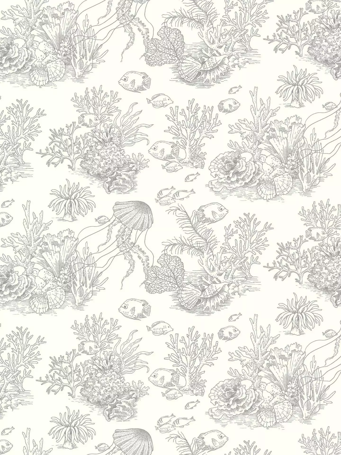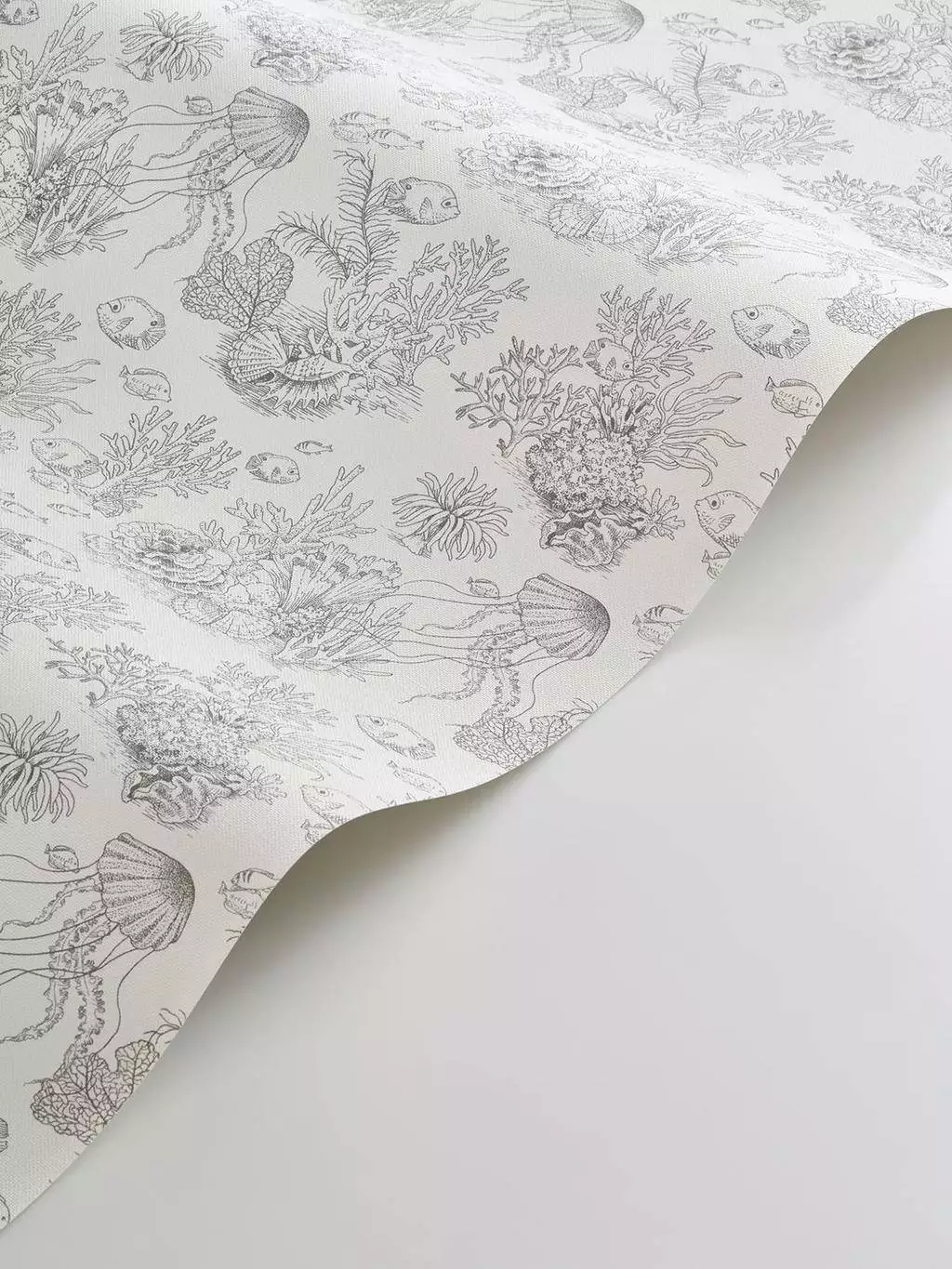 Das sanfte Grau der Tapete Côte Sauvage – Gris mouette mutet an wie ein illustrierter Traum, in dem zarte Fische und feine Korallen wie gezeichnete Träume schweben. Die Szene schenkt einem Raum die Atmosphäre von Klarheit und Gelassenheit - leicht, maritim und wohltuend ruhig. Die traditionelle Anmutung von Toile de Jouy trifft hier auf die poetische Bildwelt einer Unterwasserlandschaft – ein Design, das frei wirkt, subtil erzählt und Interieurs mit feiner Zurückhaltung in maritime Weite verwandelt. In dieser Farbgebung wirkt Côte Sauvage zurückgenommen, erholsam, fast meditativ, und schenkt Räumen eine klare, elegante Atmosphäre, die zum Durchatmen einlädt und den Alltag in sanfte Töne verwandelt.