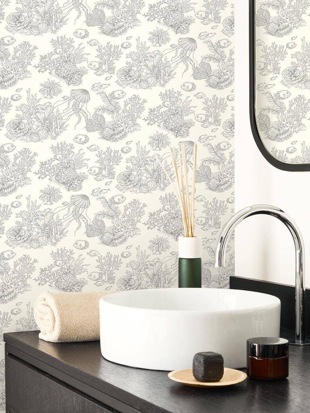 Das sanfte Grau der Tapete Côte Sauvage – Gris mouette mutet an wie ein illustrierter Traum, in dem zarte Fische und feine Korallen wie gezeichnete Träume schweben. Die Szene schenkt einem Raum die Atmosphäre von Klarheit und Gelassenheit - leicht, maritim und wohltuend ruhig. Die traditionelle Anmutung von Toile de Jouy trifft hier auf die poetische Bildwelt einer Unterwasserlandschaft – ein Design, das frei wirkt, subtil erzählt und Interieurs mit feiner Zurückhaltung in maritime Weite verwandelt. In dieser Farbgebung wirkt Côte Sauvage zurückgenommen, erholsam, fast meditativ, und schenkt Räumen eine klare, elegante Atmosphäre, die zum Durchatmen einlädt und den Alltag in sanfte Töne verwandelt.