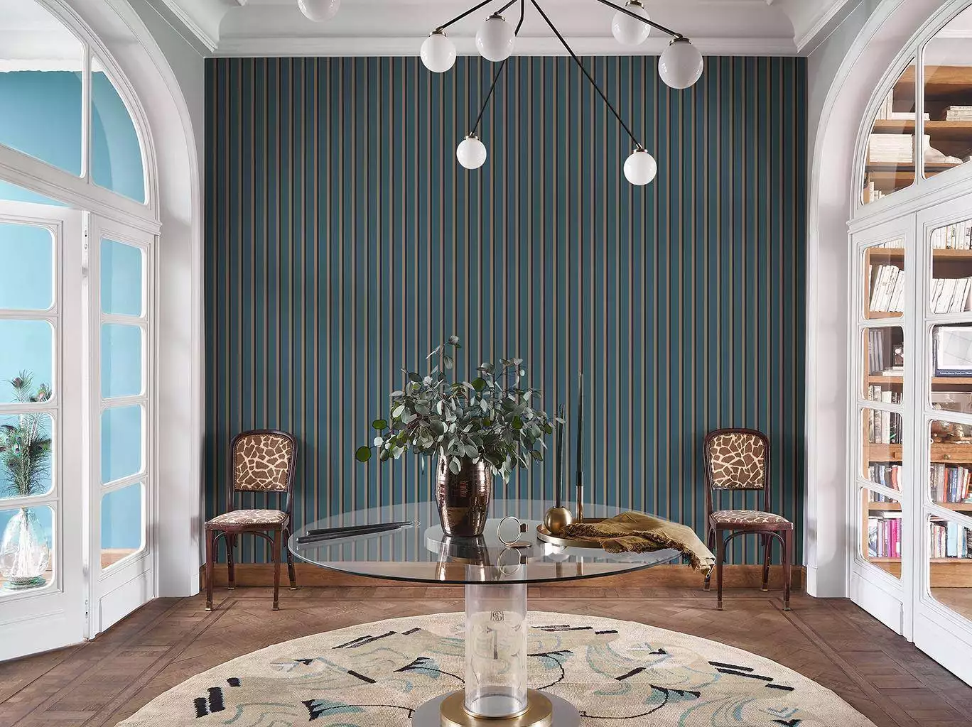 Geradezu herrschaftliches Raumdesign. Die Tapete Derby Country Club von Casadeco bringt einen Hauch von exquisitem Luxus in den Raum. Ihr Design ist inspiriert von klassisch englischen Herrenanzügen. Die präzise gestreifte Struktur, betont durch dezente Puff- und Irisierungseffekte, gibt jeder Wand einen stilvollen, luxuriösen Charme. Erhältlich in fünf Farbvarianten.