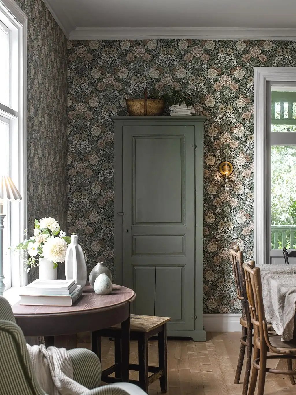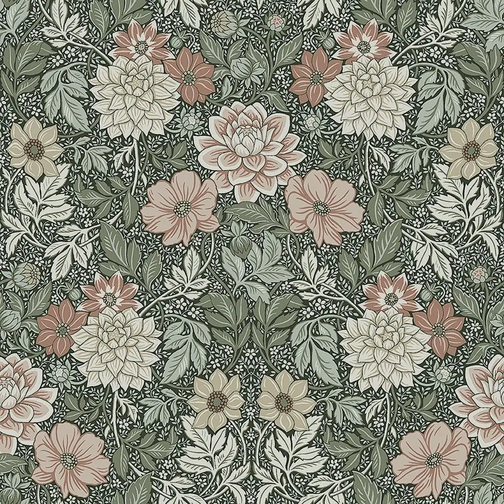Landhaustapete mit üppigen Blumenmustern aus Dahlien und andern Herbstblumen.