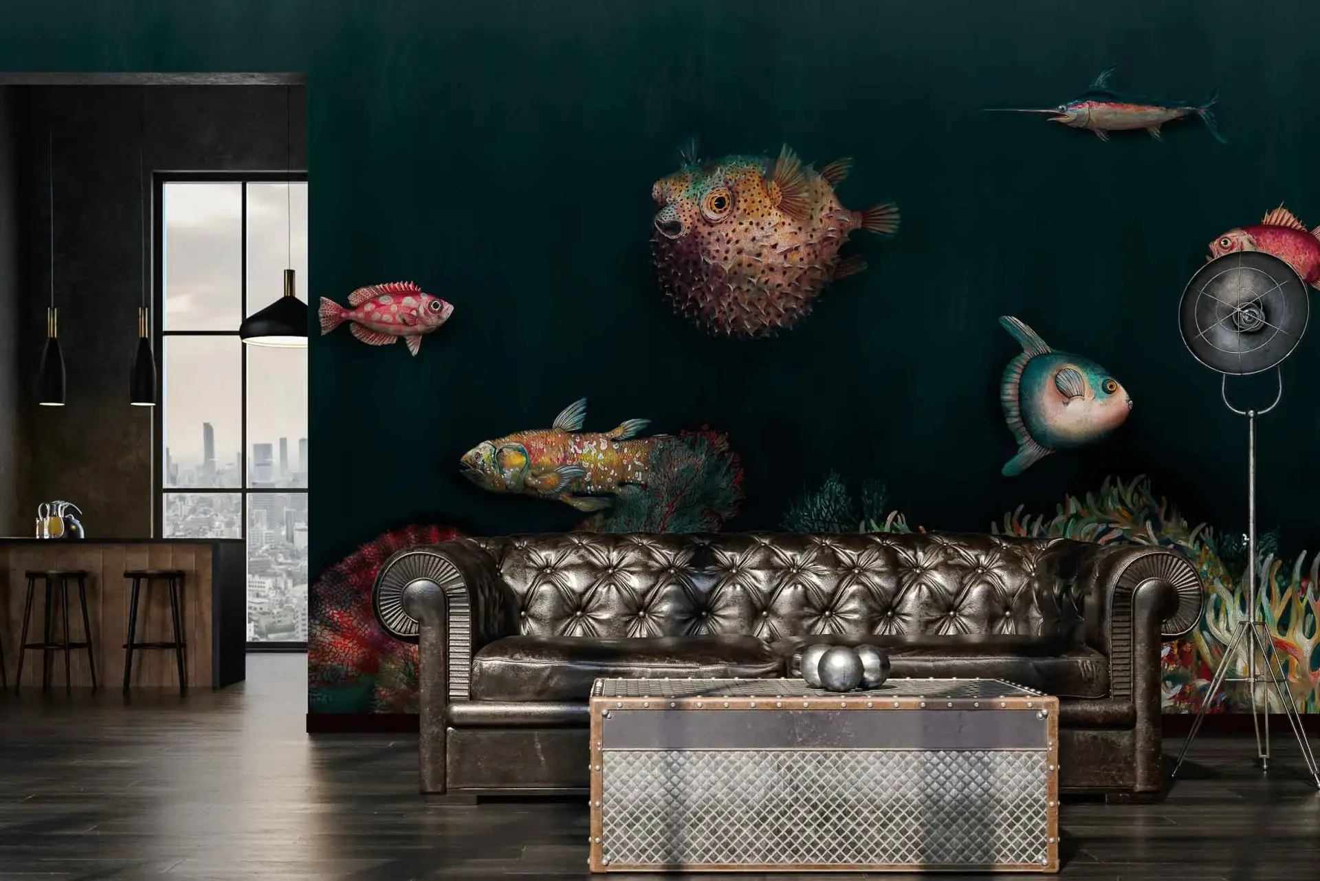 Jede Tapete wird auf Maß angefertigt, um sicherzustellen, dass sie perfekt zu Ihren Raumdimensionen passt. Das zentrale Motiv, ein freundlicher Kugelfisch, zieht sofort alle Blicke auf sich und verleiht dem Raum einen einzigartigen Charme.