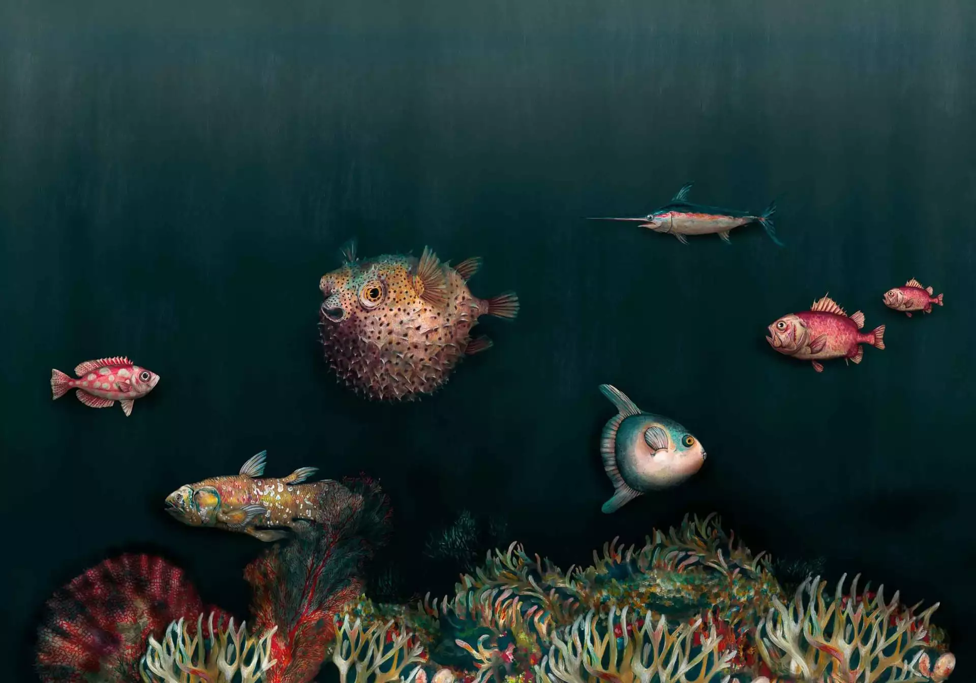 Entdecken Sie mit der Tapete von Coordonne aus Barcelona eine faszinierende Unterwasserwelt voller Farben und Leben. Bunte und lebendige Illustrationen von Tiefsee-Fischen präsentieren sich vor einem dunklen Hintergrund und entführen Sie in eine Welt voller Geheimnisse und Schönheit.
