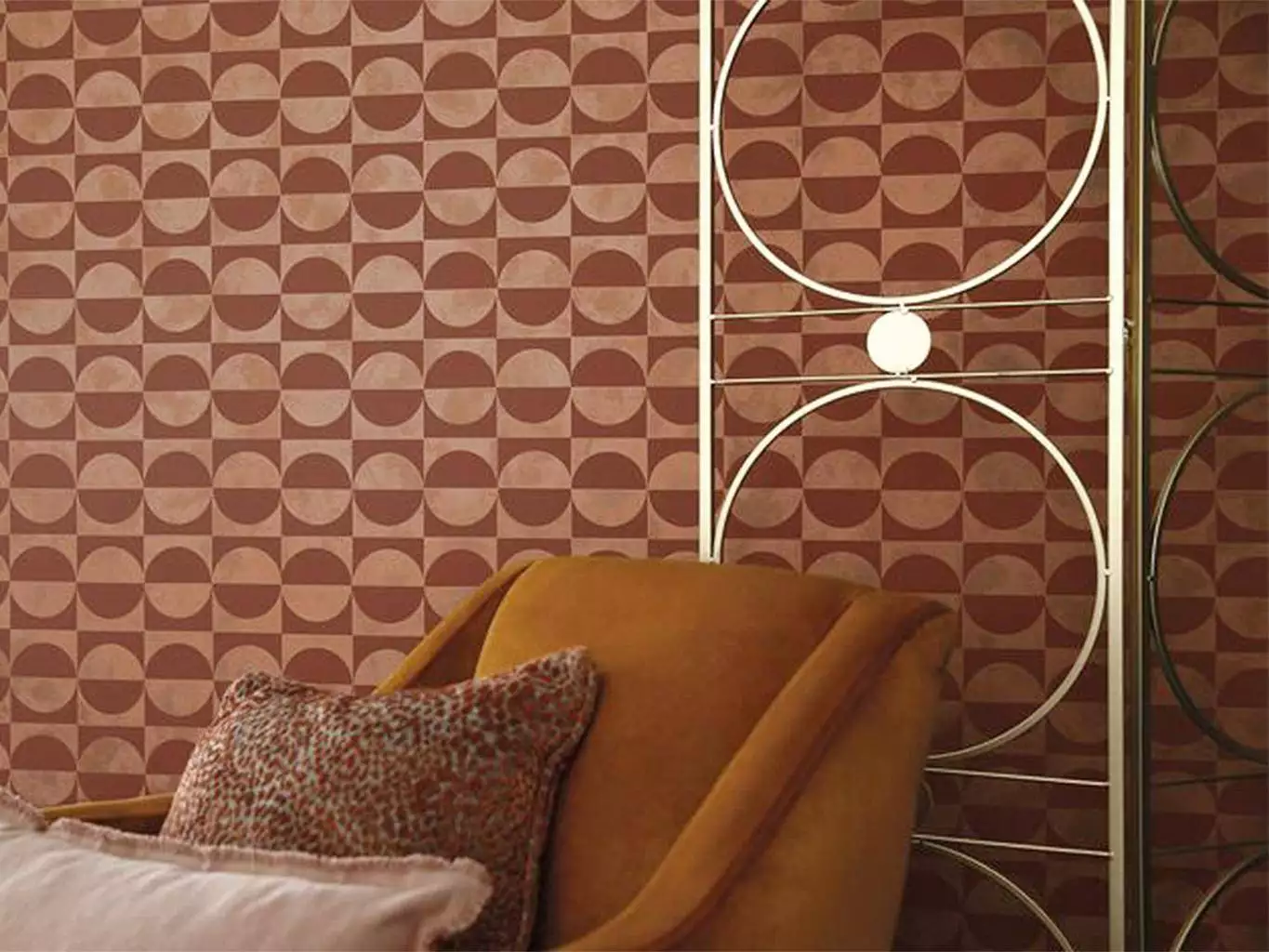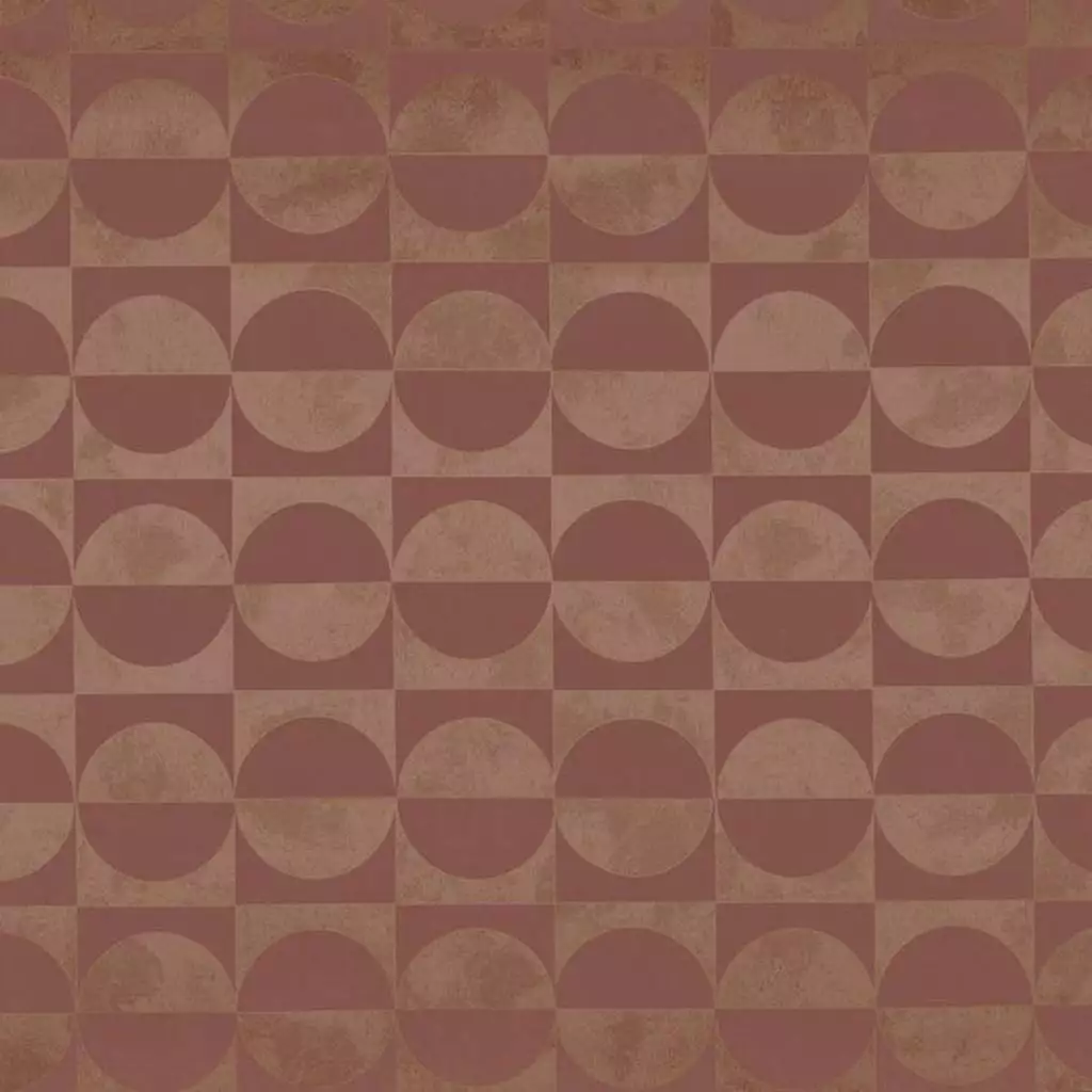 Die Tapete Delta Circles, col. 4 zeigt ein regelmäßig angeordnetes Muster aus Halbkreisen und Vollflächen in warmen Rot- und Terrakottatönen. Die geometrische Struktur wirkt präzise, bleibt durch die weichen Farbübergänge jedoch lebendig. Das Zusammenspiel aus Kontrast und Rhythmus verleiht der Fläche eine grafische Spannung mit klarer Retro-Anmutung.