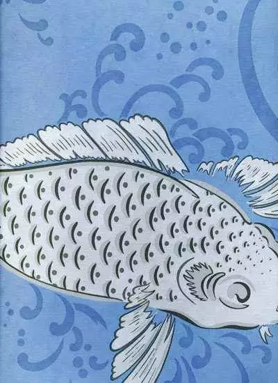 Mit Ornamenten verzierter Kol-Karpfen in aufgewühltem Gewässer, benannt nach dem Wald und Fluss "Derwent" in der englischen Region Cumbria (früher Cumberland).