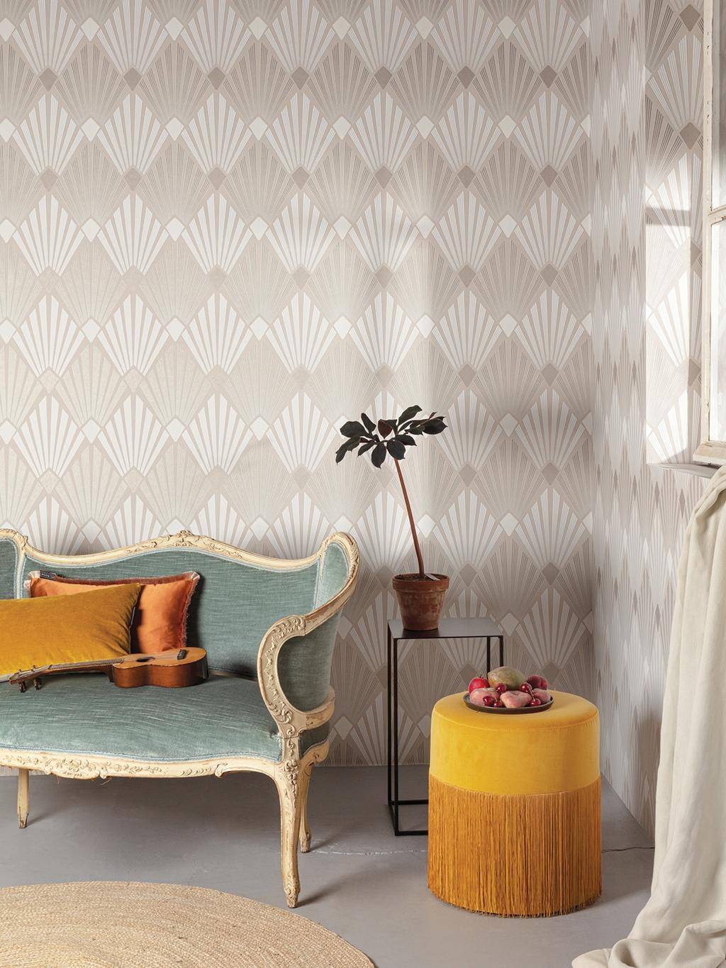 Die Tapete Diego Oyster verkörpert elegante Art-Deco-Ästhetik in sanften, perlmuttschimmernden Tönen. Ihr grafisches Fächermotiv erinnert an die glanzvolle Ära der 1920er-Jahre und bringt zugleich eine ruhige, stilvolle Modernität in den Raum. Ein Design, das Leichtigkeit und Struktur harmonisch vereint.