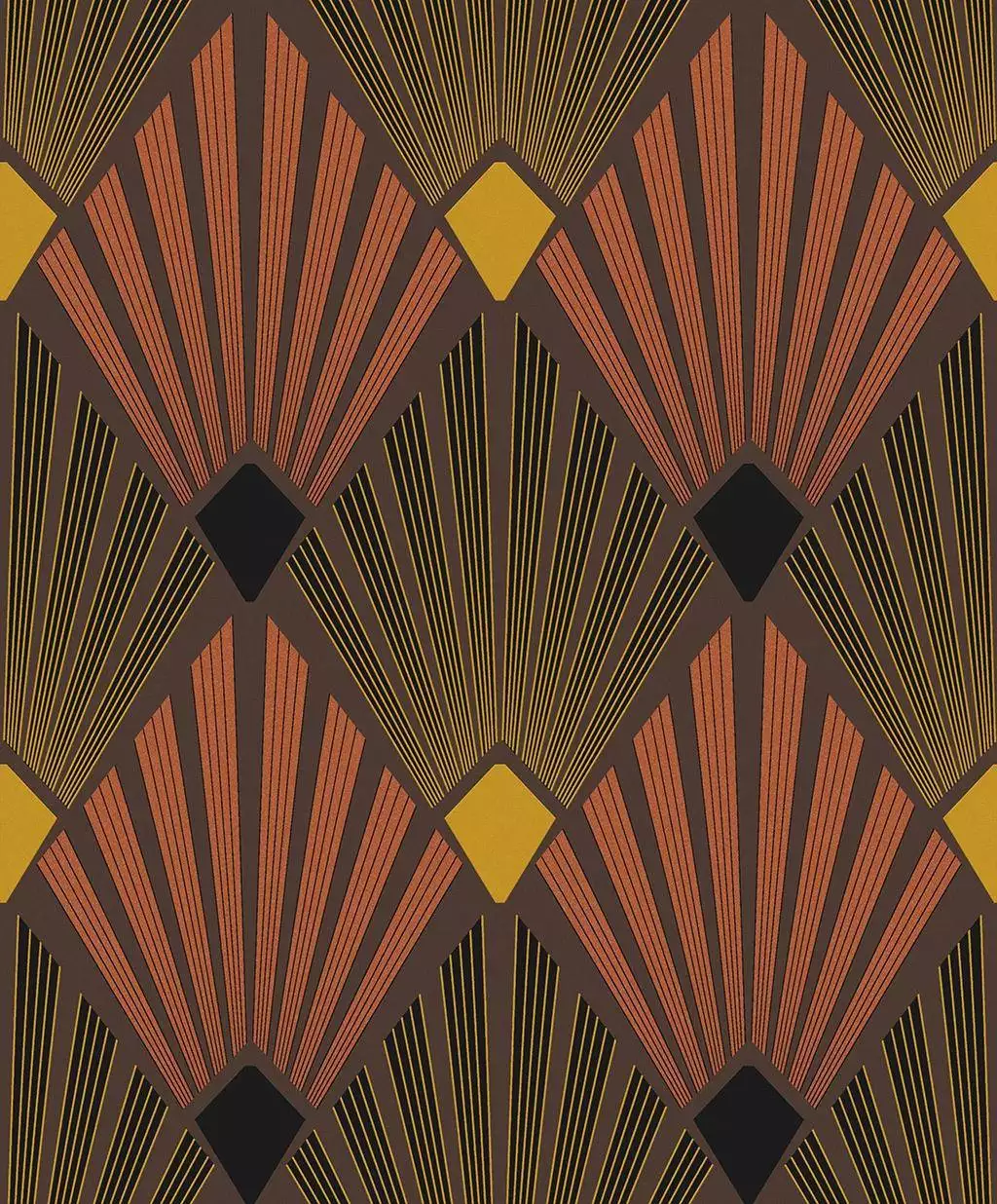 Die Tapete Diego Sierra verbindet kraftvolle Art-Deco-Geometrie mit warmen Tönen von Kupfer, Gold und Schwarz. Das dynamische Fächermotiv entfaltet eine ausdrucksstarke Tiefe und verleiht dem Raum eine markante, zugleich elegante Ausstrahlung.