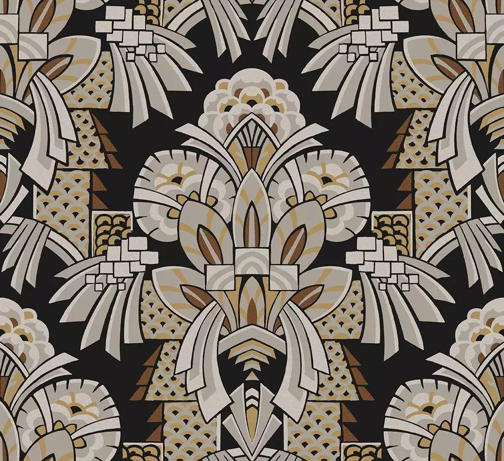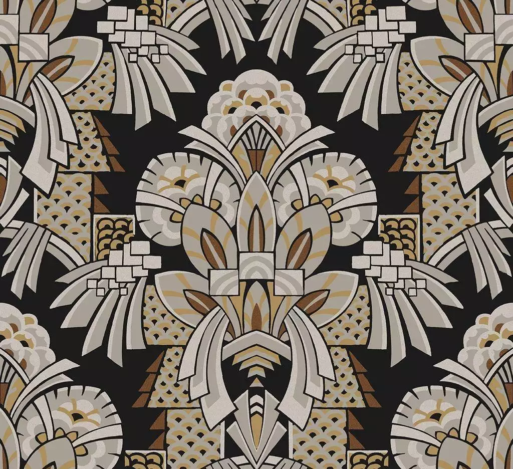 Das Tapetenmotiv Dorothy ist ein bewusst imposantes Motiv, das mit großen, markanten Formen arbeitet und im Raum sofort Präsenz zeigt. Die Art Déco Tapete gibt es in drei Varianten: einer warmen hellbraun-silbernen Version, einer dunkleren grau-schwarzen Ausführung und einer intensiven Kombination mit Kobaltblau. Jede Farbstellung bringt ihre eigene Spannung mit, bleibt aber klar im Charakter: kraftvoll, modern und unübersehbar.