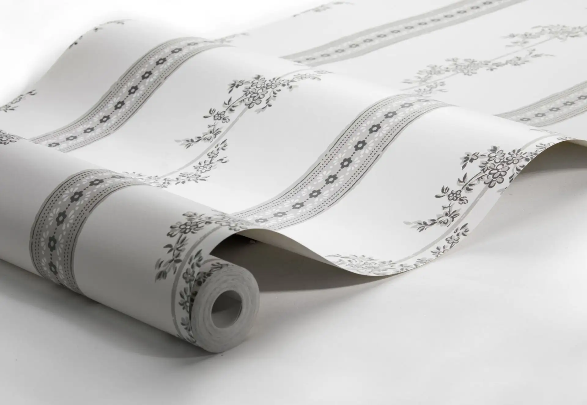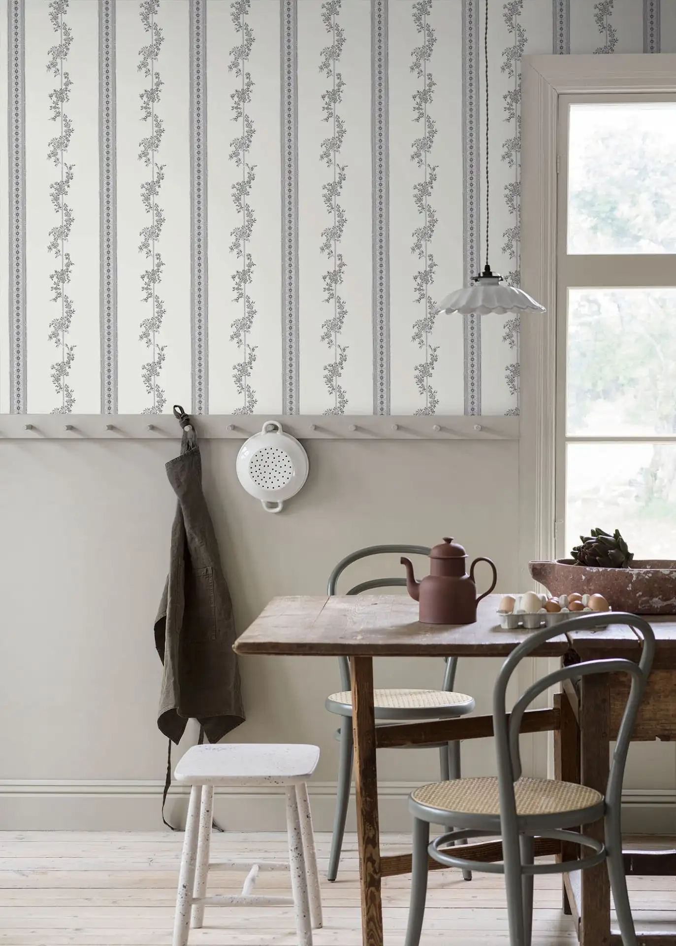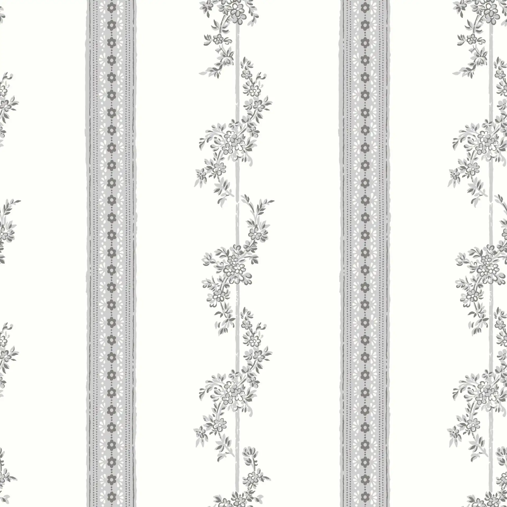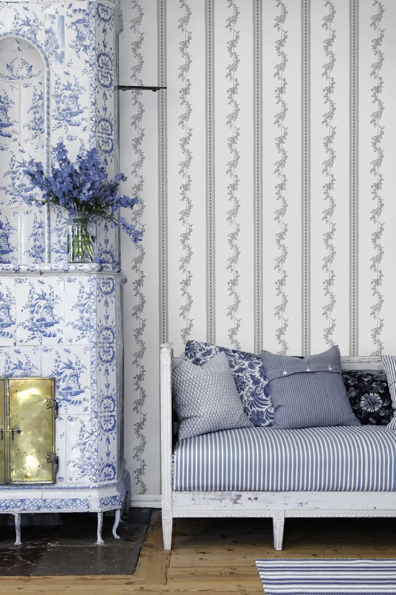 Die Tapete Drottningholm, col. 8 zeigt ein elegantes, klassisches Streifenmuster in zarten Grautönen auf weißem Grund. Zwischen den breiteren Streifen verlaufen filigrane Ranken mit kleinen Blättern, die dem Design einen dezent romantischen und historischen Charakter verleihen. Das Muster wirkt zeitlos und harmoniert gut mit traditioneller oder skandinavischer Einrichtung.