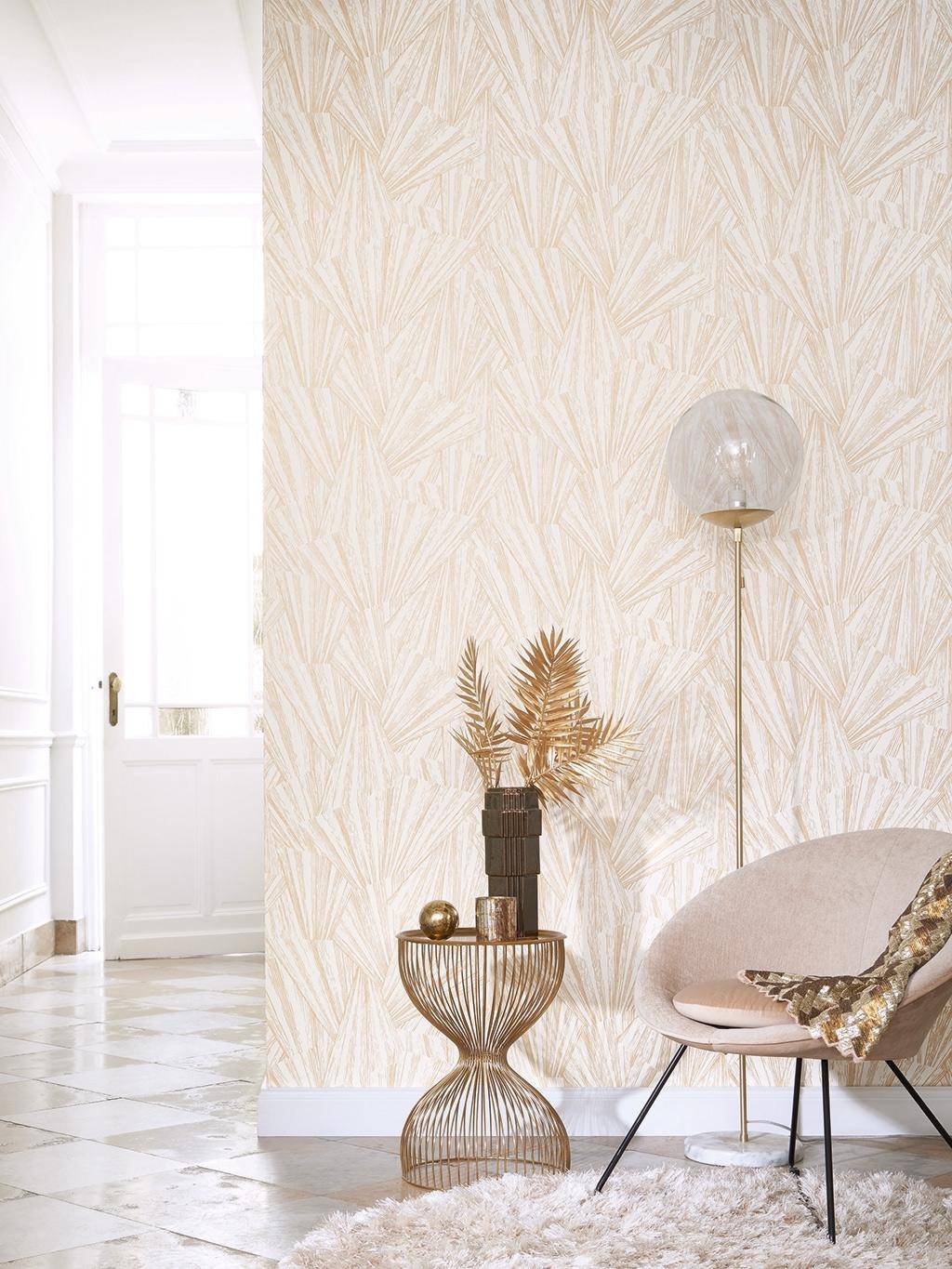 Mit unserer Tapete Eclate Foli im Art Déco-Stil geben Sie Ihren Räumen einen expressiven, starken Charakter. Die Vliestapete bietet alles, was die Stilrichtung des Art Déco ausmacht: großflächige Wirkung mit satten Farben und prunkvollen Akzenten durch den satten Goldton. In der dunklen Farbvariante mit dem leuchtenden Grün und den vielen goldenen Linien, die sich fächerförmig über die Wand ziehen, wirkt sie an einer freien Wand fast wie ein Gemälde. Mit Möbeln im Retro-Stil der 50-er und 60-Jahre verschmilzt sie zu einer perfekten Symbiose. Die helle Variante wirkt unaufdringlich und harmoniert wunderbar mit antiken Holzmöbeln im Jugendstil, kann aber auch mit modernen Couchlandschaften und Schränken kombiniert werden. Gerade für einen Stilmix ist die Tapete Eclate Foil hervorragend geeignet – ganz Art Déco eben.