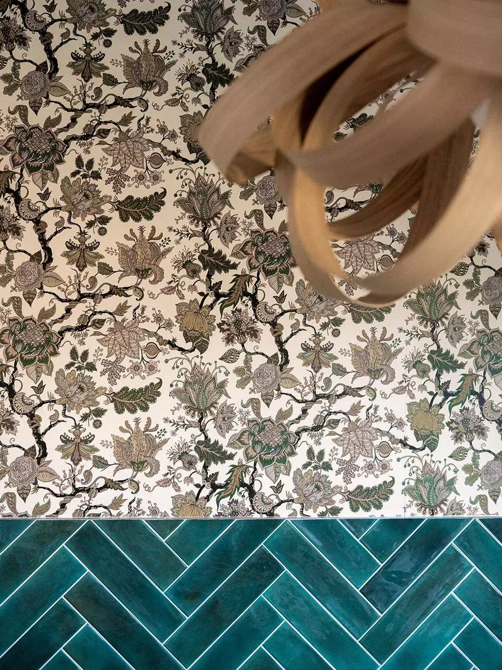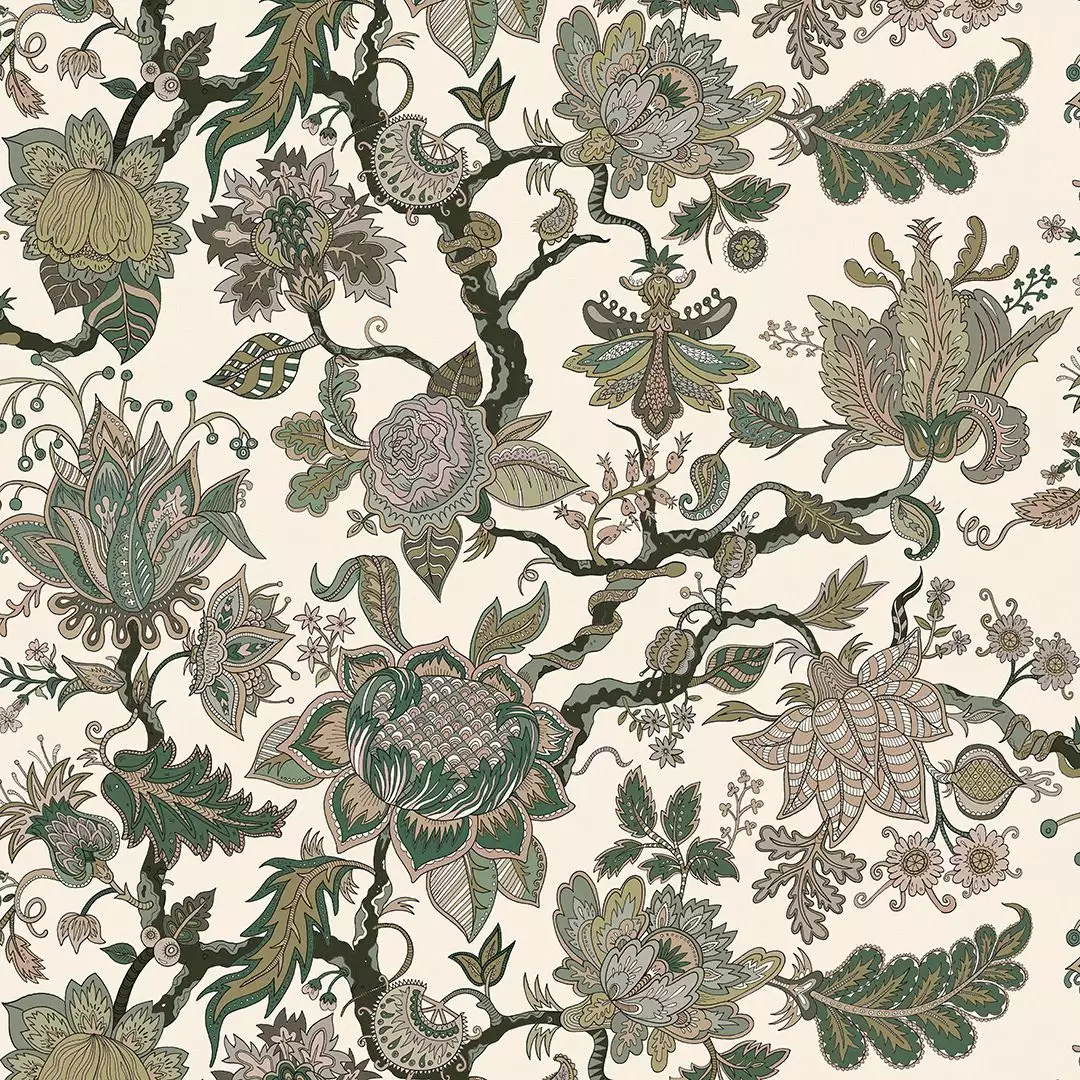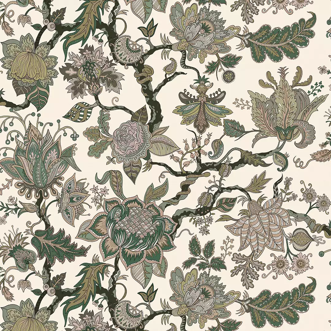 Eden Tapete in Fern-Grün. Ein handgemaltes "Baum des Lebens"-Motiv, aber mal anders! Mit stilisierten indischen Blumen, ungewöhnlichen Fruchtmotiven, detailliertem Blattwerk und versteckten Schlangen. Die Farben sind in tiefen Grün-, Oliven- und Erdtönen gehalten und liegen auf einem schönen cremefarbenen Grund. Eden ist wirklich der Garten der Versuchung und wird garantiert das Gesprächsthema im Raum sein.