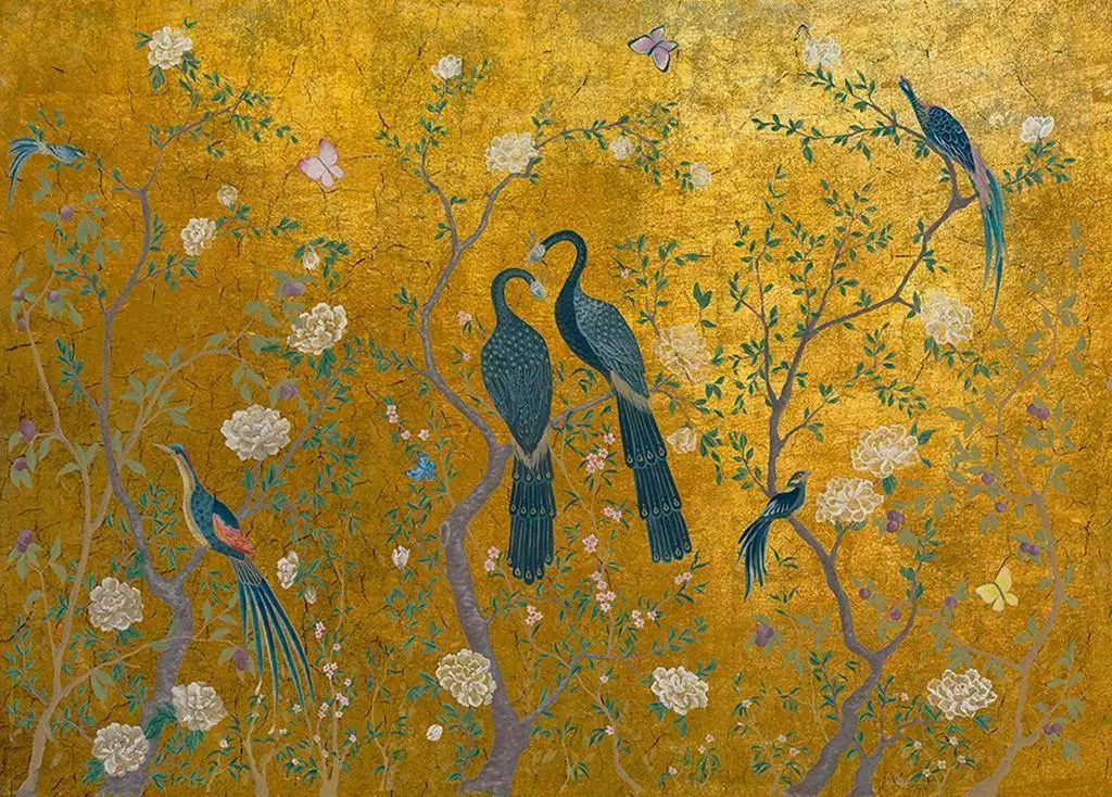 Die Tapete Edo Gold ist eine luxuriöse, maßgefertigte Tapete, inspiriert von traditionellen japanischen Wandmalereien. Der schimmernde Goldhintergrund verleiht Tiefe und Eleganz, während kunstvoll illustrierte Vögel, blühende Zweige und Schmetterlinge eine harmonische, naturverbundene Szenerie erschaffen. Die detailreiche Gestaltung in tiefem Blau, Grün- und Erdtönen setzt sich kontrastreich vom goldenen Fond ab und sorgt für eine opulente, zeitlose Ästhetik. Perfekt für elegante Wohnräume, gehobene Hotels oder stilvolle Empfangsbereiche – diese Tapete ist ein echtes Statement-Piece für anspruchsvolle Interieurs.