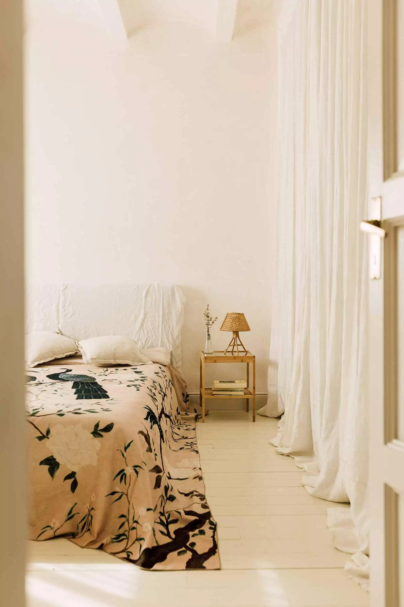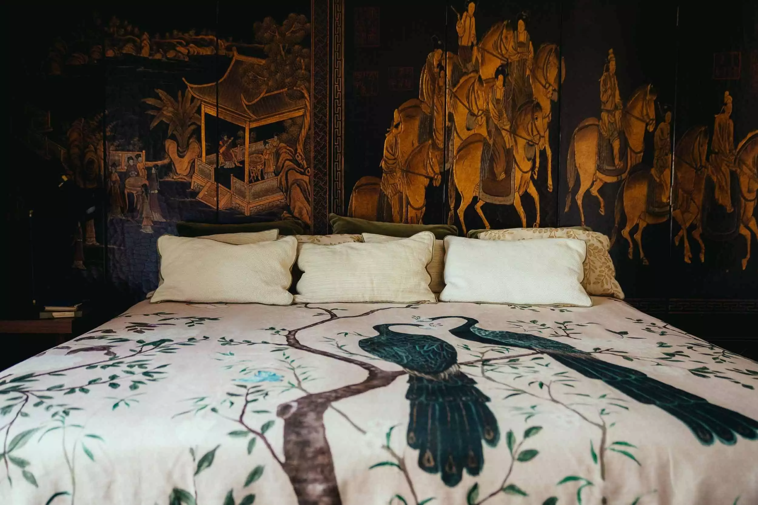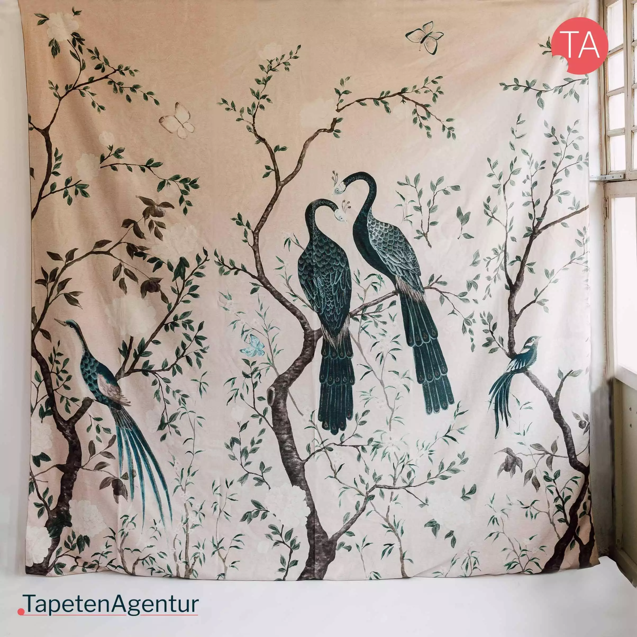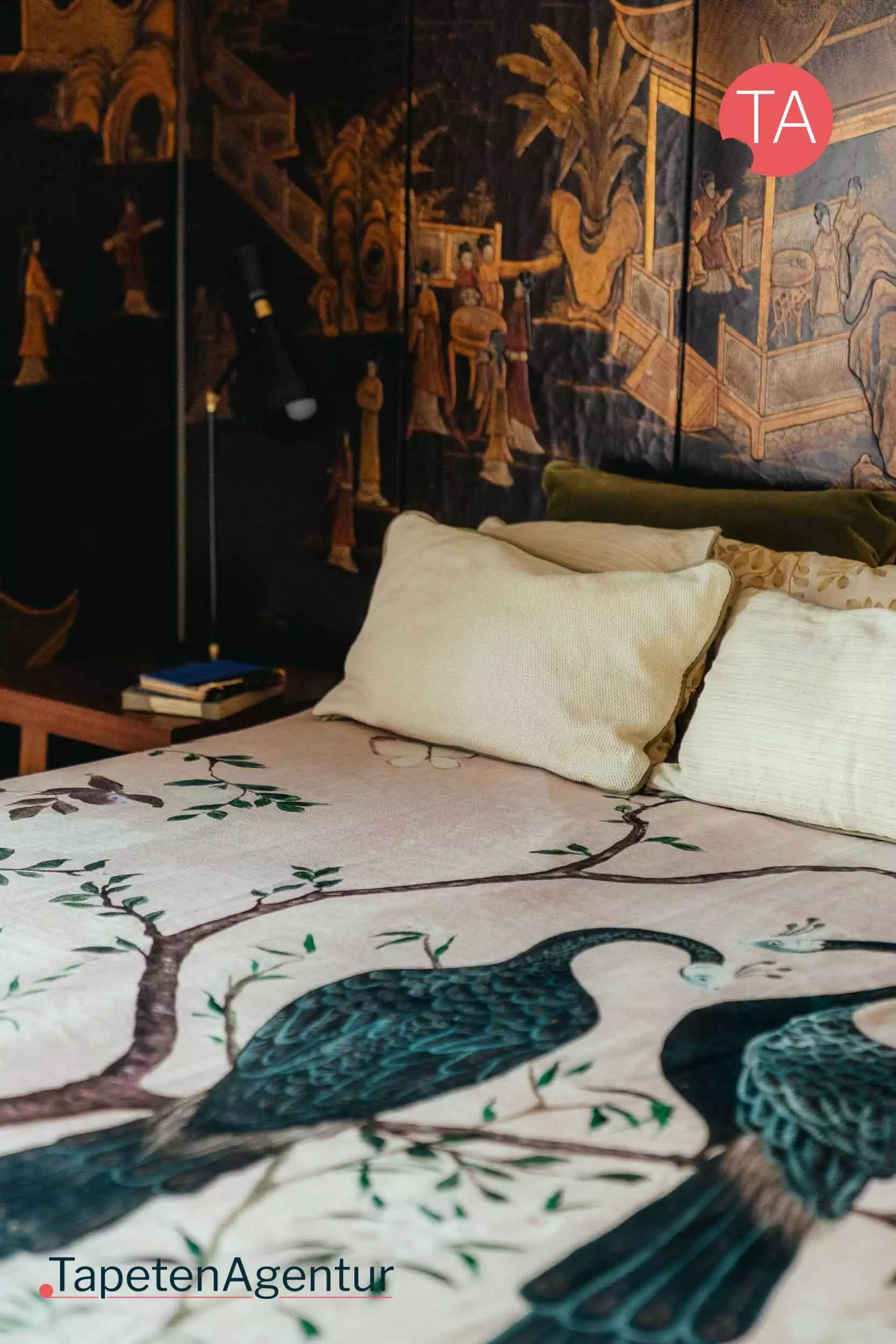Keine Tapete - Die Chinoiserie-Wandteppiche sind eine himmlische Art, Ihr Bett mit Stoffen aus dem Orient zu bedecken. Bukolische Szenen, die Sie an magische Orte entführen. Die Noblesse von Leinen, die Schlichtheit von Baumwolle und der Faltenwurf von Viskose schaffen eine unwiderstehliche Eleganz.