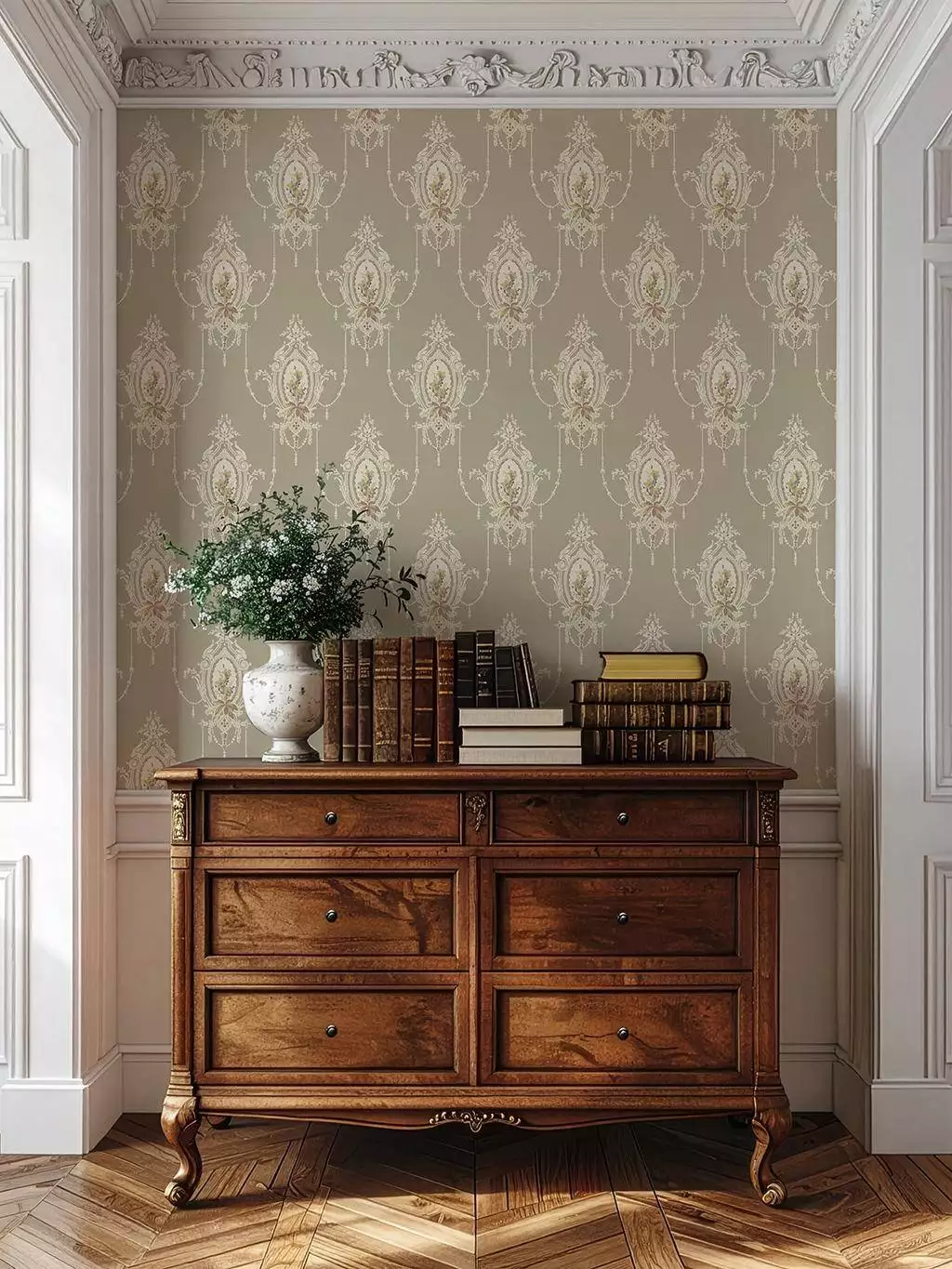 Die Tapete Edsbyn verbindet Leichtigkeit, Grazie und kreidige Struktur. Das Design zeigt ein leichtes, anmutiges Medaillon und weckt Träume von Italien, einem Land, das 1800-1890 sehr in Mode war. Zarte Linien und matte Farben schaffen eine wohnliche Ruhe, die sich mühelos in moderne Räume fügt – ein Muster mit klassischer Herkunft und zeitloser Gelassenheit. Wie gemacht für Räume, die Geschichten kennen – und in denen neue beginnen.