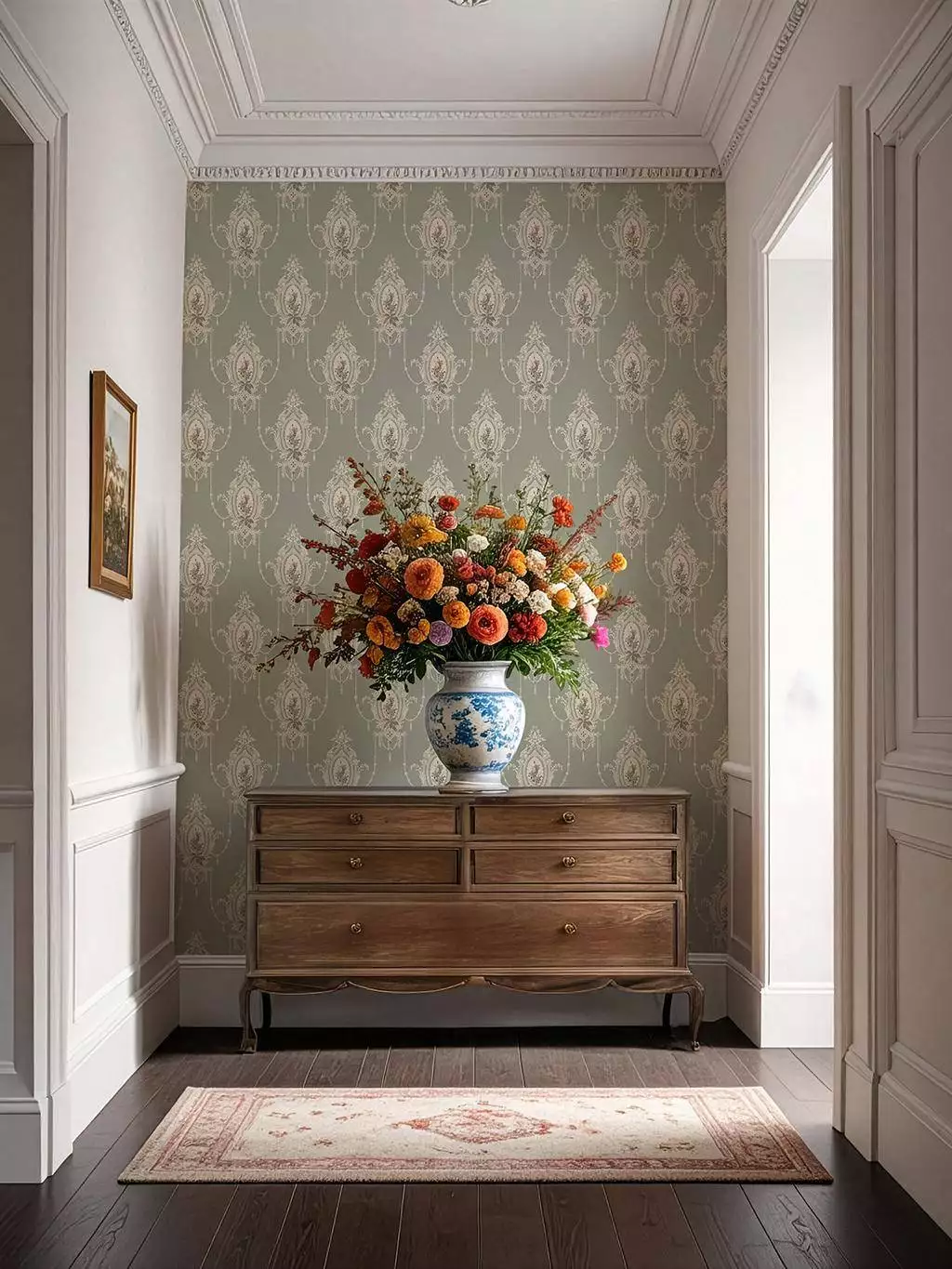 Die Tapete Edsbyn verbindet Leichtigkeit, Grazie und kreidige Struktur. Das Design zeigt ein leichtes, anmutiges Medaillon und weckt Träume von Italien, einem Land, das 1800-1890 sehr in Mode war. Zarte Linien und matte Farben schaffen eine wohnliche Ruhe, die sich mühelos in moderne Räume fügt – ein Muster mit klassischer Herkunft und zeitloser Gelassenheit. Wie gemacht für Räume, die Geschichten kennen – und in denen neue beginnen.