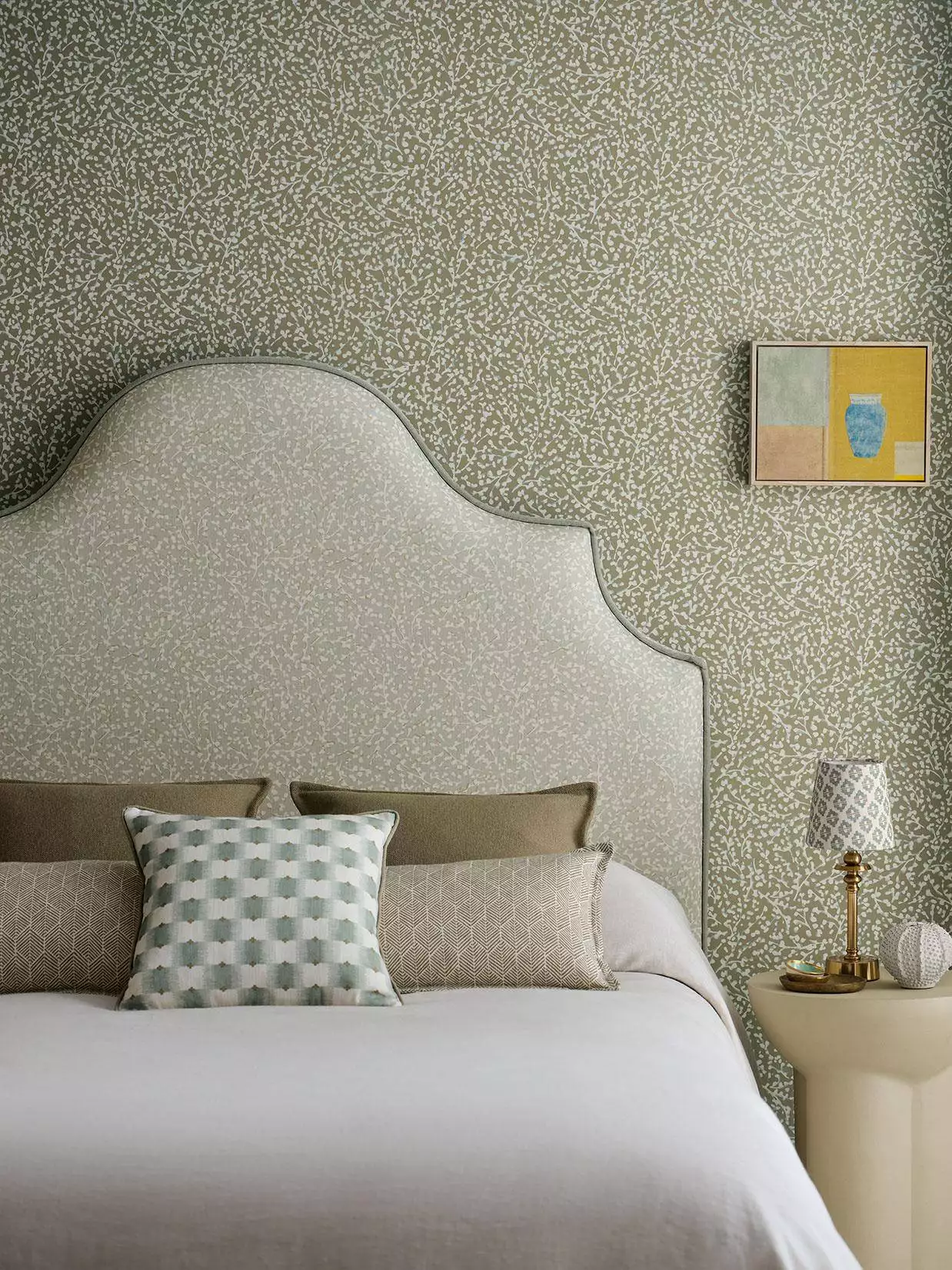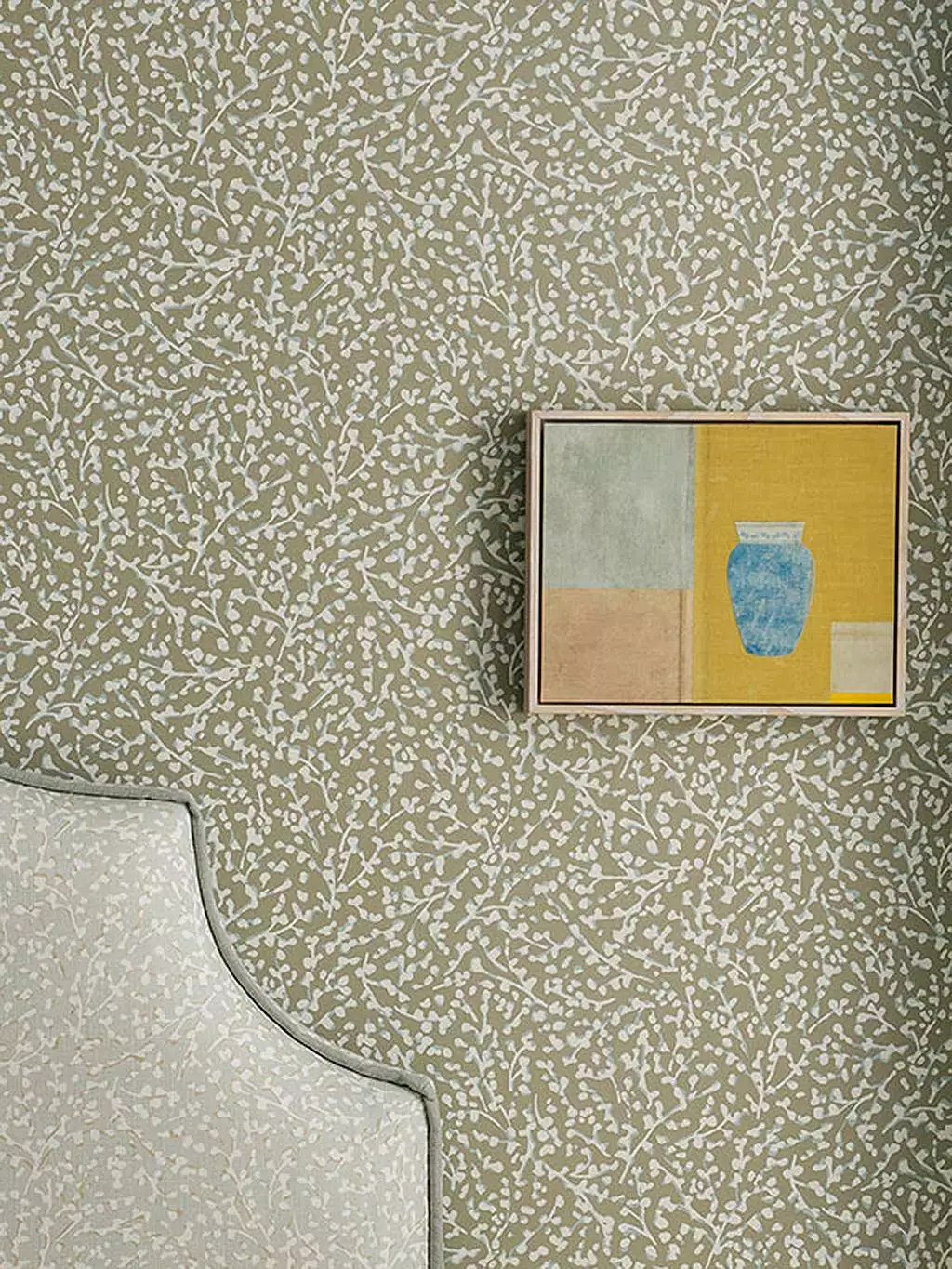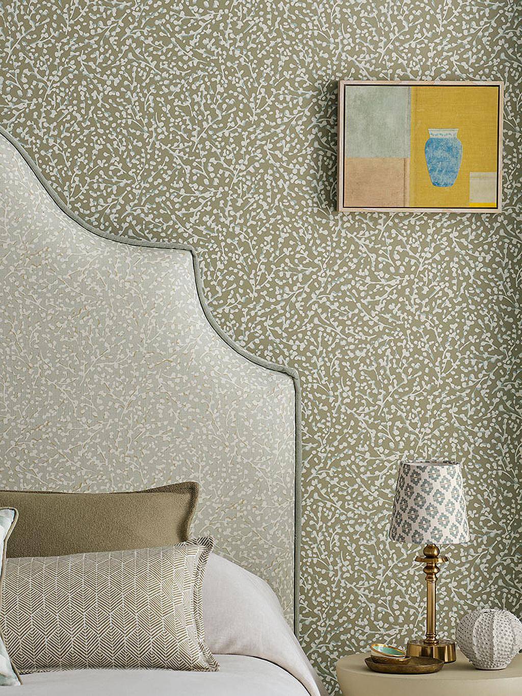 Die Tapete Eleni aus der Kollektion Aubin von Romo zeigt ein Geflecht aus feinen Zweigen und Blättern, das sanft über die Wand zu fließen scheint. Durch die Schichtung von Farben entsteht eine subtile Tiefe, die an handgedruckte Strukturen erinnert. Die Oberfläche wirkt wertvoll und kreidig und verleiht dem Motiv eine schlichte, moderne Präsenz – ruhig, unaufgeregt und von stiller Handwerkskunst geprägt.