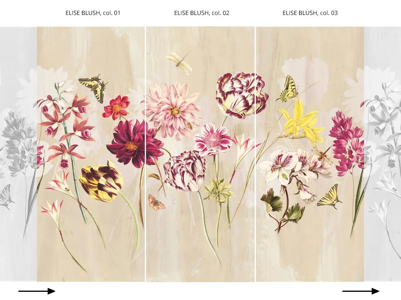 Die Tapete "ELISE BLUSH" erhalten Sie im Online-Shop der TapetenAgentur in insgesamt drei Variationen. In den Raumbildern sind ggf. mehrere Bahnen verschiedener Artikel abgebildet (zu finden in Varianten). Die 3 Artikel/Bahnen können in der Reihenfolge: col.01 plus col.02 plus col.03 ... fortlaufend kombiniert werden.