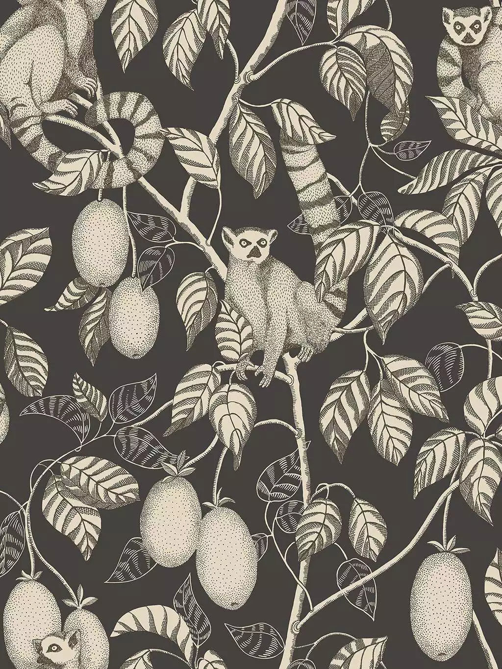 Die Tapete Elliot fasziniert mit neugierigen Lemuren, die sich geschickt im üppigen Blattwerk verstecken. Die Graphittöne und aufwendigen Details schaffen eine exotische Atmosphäre, die den Raum nahtlos aufwertet und einen Hauch von ungebändigter Natur ins Haus bringt.