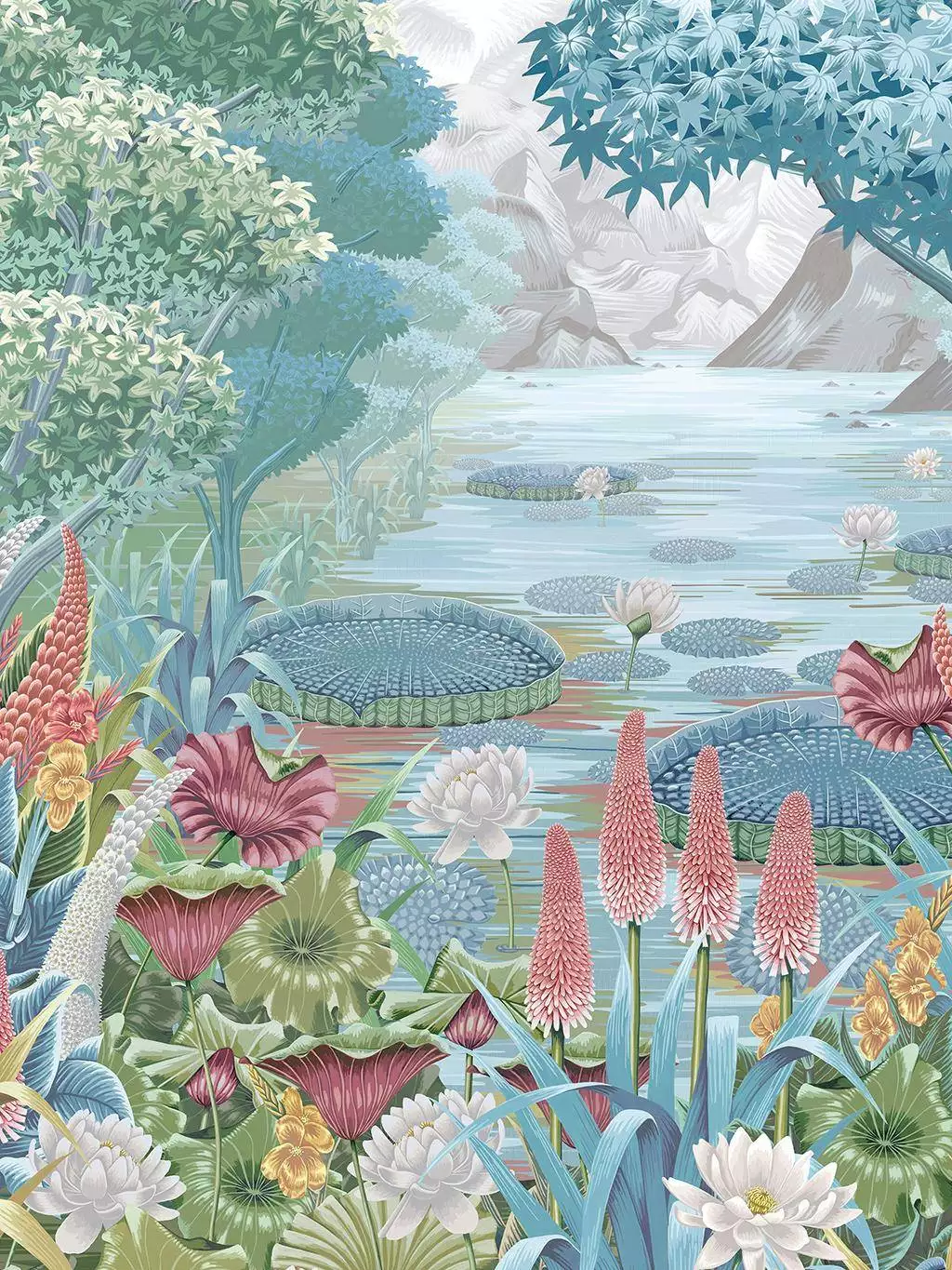 Elysium Mural ist ein Wandbild, das eine idyllische Landschaft mit schönem Blick auf einen See mit Bergen darstellt, die Ruhe, Schönheit und Harmonie verkörpert. Diese Farbvariante präsenteirt einen blassen, aber dennoch farbenfrohen Look.