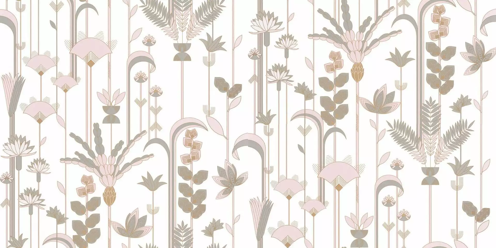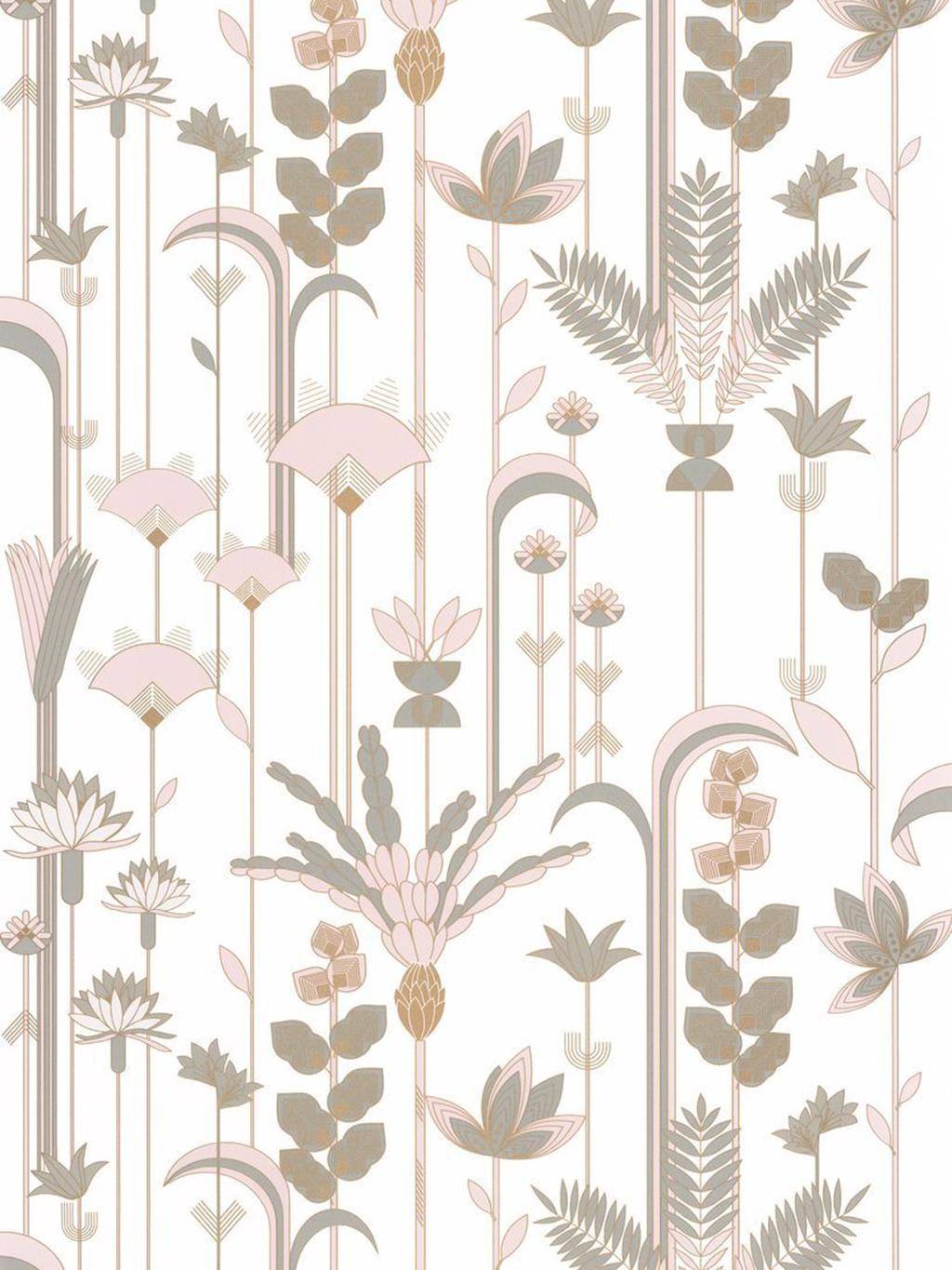 In dieser hellen Version wirkt die Tapete Ephemeral fast grafisch: feine Rosé- und Grautöne, klare Linien, ein ruhiger Weißgrund, ein Art Déco Twist auf den zweiten Blick. Die Elemente stehen leicht voneinander gelöst, sodass das Muster auch in kleineren Räumen gut funktioniert. Besonders stimmig ist die Tapete in Arbeitsbereichen, Fluren oder neben natürlichen Materialien wie hellem Holz und Stein – dort entsteht eine klare, freundliche Struktur, die Räume geöffnet wirken lässt.