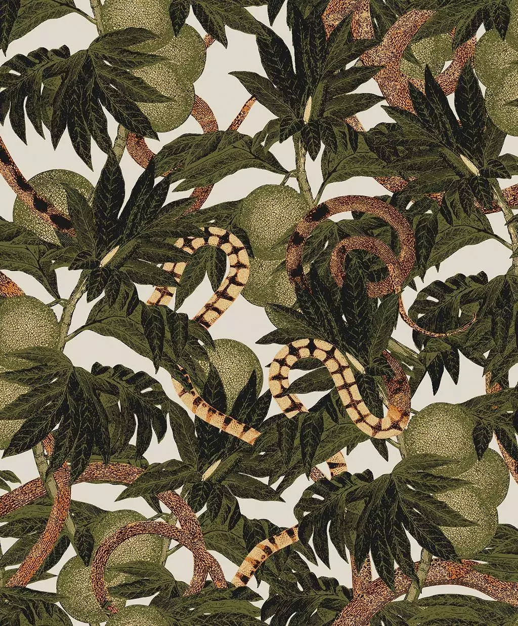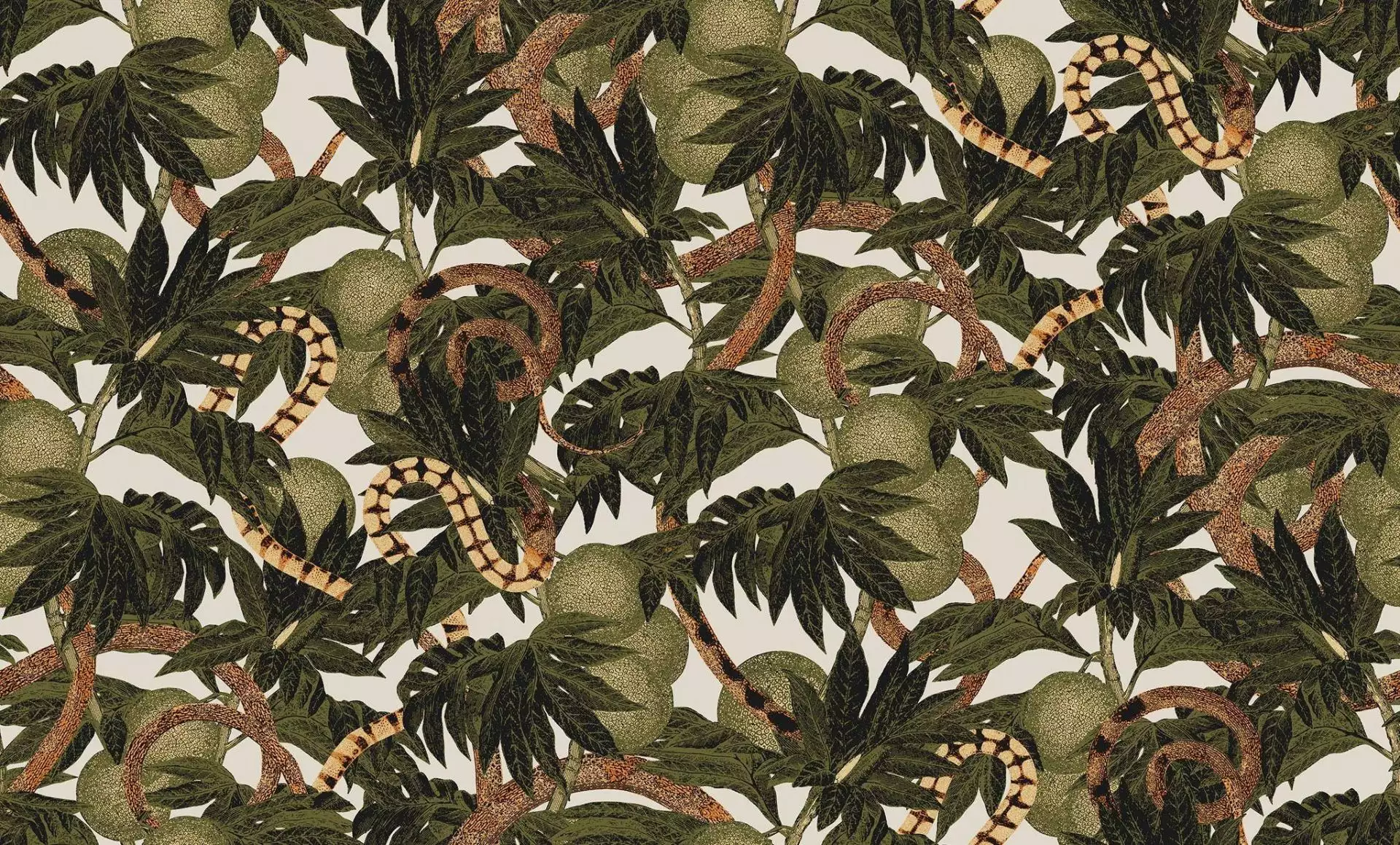 Die Tapete Equator, Jungle entführt Sie in die faszinierende Welt des tropischen Regenwaldes. Lebendige Blätter und exotische Früchte verschmelzen mit auffälligen Mustern von Schlangen und Ästen. Die satten Grüntöne und warmen Goldakzente erzeugen eine luxuriöse, abenteuerliche Atmosphäre. Perfekt für alle, die natürliche Eleganz mit einer wilden, mutigen Note verbinden möchten.