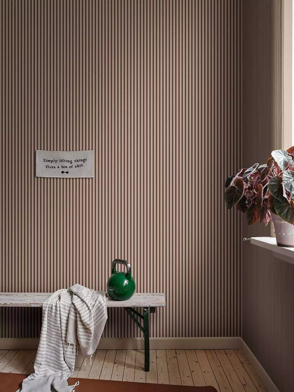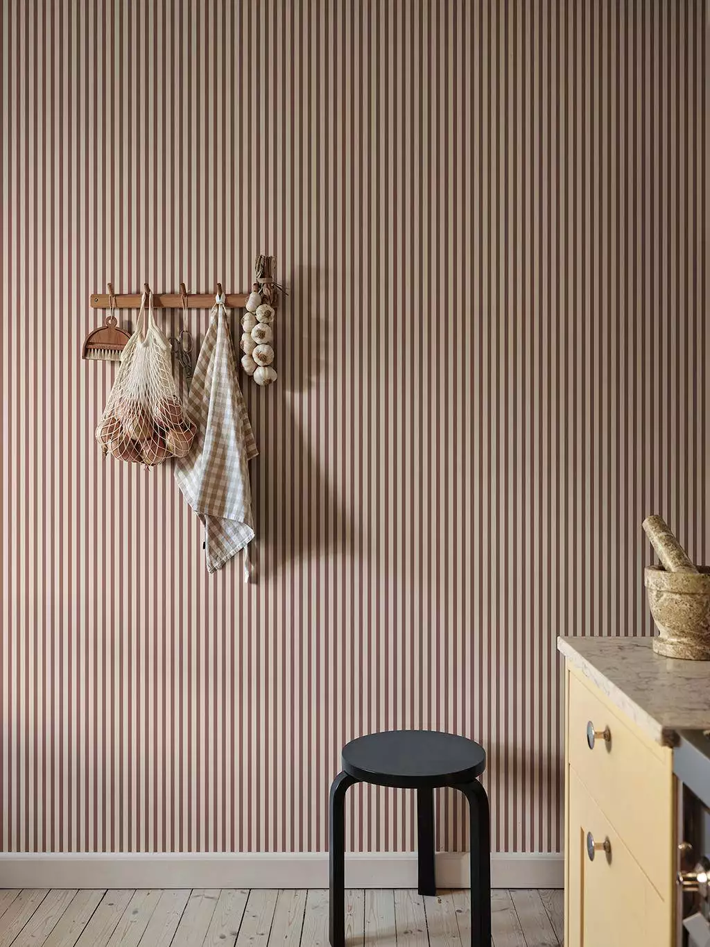 Warmes Braun, schlanke Streifen, schlichte Grafik - all das korrespondiert wunderbar und macht die Tapete Estelle Burgundy in ihrer Einfachtheit wunderschön. Die Kollektion Familjen fängt die Wärme, Spontaneität und den Charakter eines mit Liebe gefüllten Hauses ein. So wie eine Familie aus vielen verschiedenen Persönlichkeiten und Wünschen besteht, bietet diese Kollektion eine vielfältige Auswahl an Designs, die sich harmonisch ergänzen.