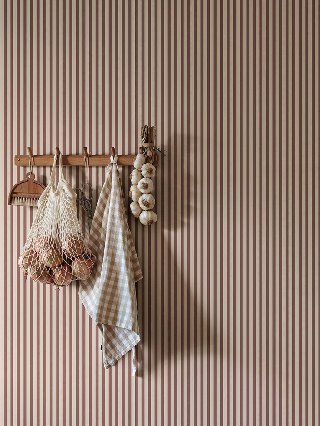 Warmes Braun, schlanke Streifen, schlichte Grafik - all das korrespondiert wunderbar und macht die Tapete Estelle Burgundy in ihrer Einfachtheit wunderschön. Die Kollektion Familjen fängt die Wärme, Spontaneität und den Charakter eines mit Liebe gefüllten Hauses ein. So wie eine Familie aus vielen verschiedenen Persönlichkeiten und Wünschen besteht, bietet diese Kollektion eine vielfältige Auswahl an Designs, die sich harmonisch ergänzen.