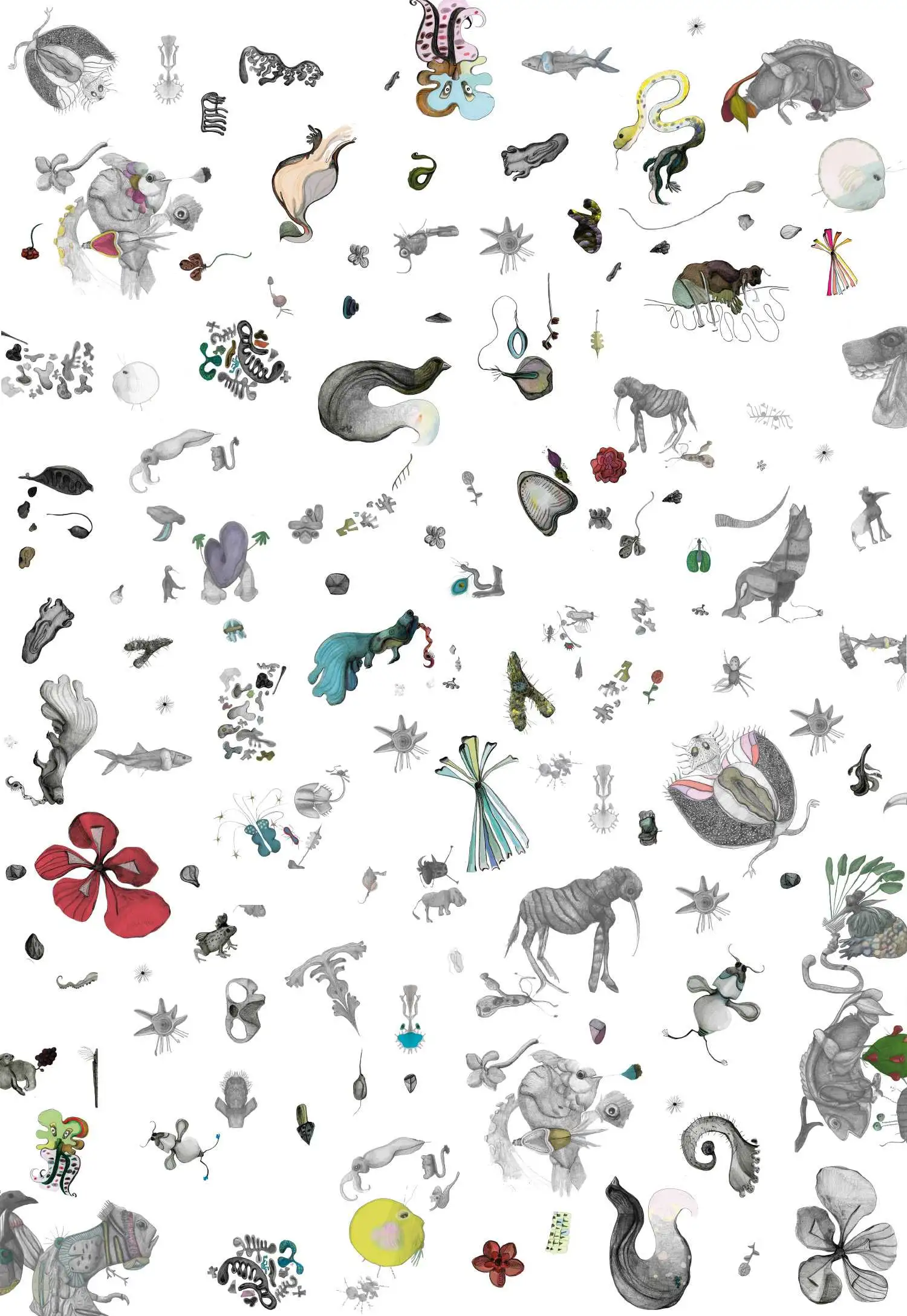 Dieses Wandbild zeigt aufwendige Bleistiftzeichnungen bezaubernder Fabelwesen aus der Tier und Pflanzenwelt. Viele außergewöhnliche Wesen wollen idealerweise bei Ihnen zu Hause entdeckt werden. Der Pfisch, eine Mischung zwischen Pfau und Fisch, das Pfebraogel, ein Pferd, Zebra und Vogel zugleich. Jeder Betrachter zu einem Darwin, der sich über skurrile Formen selbst entdeckt.