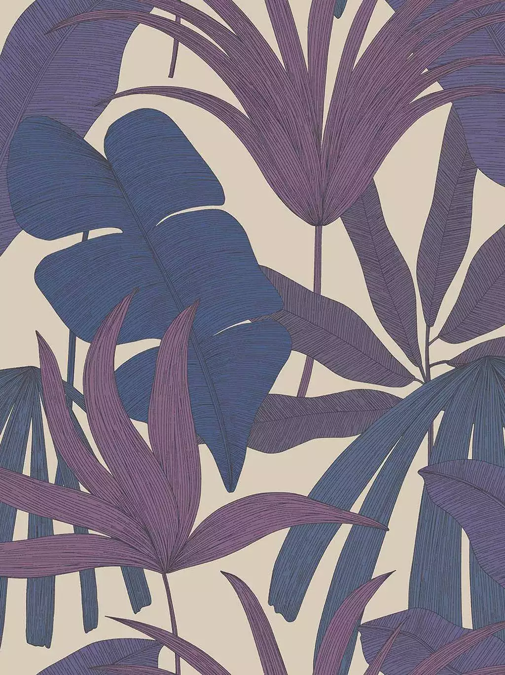 Die "Festival Flora, col. 04" Tapete kombiniert kräftige Blau- und Violetttöne mit modernen, grafischen Blattformen. Das Design bringt Lebendigkeit und einen Hauch von Retro-Charme in den Raum. Perfekt für kreative Wohnbereiche oder Akzentwände, verleiht sie jedem Interieur Tiefe, Energie und einen unverwechselbaren Charakter.