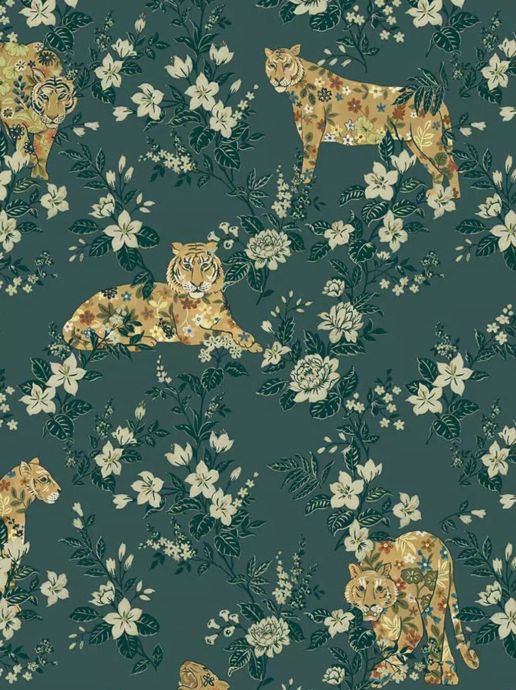 Die "Festival Tiger" Tapete verbindet florale Eleganz mit exotischem Flair. Auf einem tiefen Grün tummeln sich dekorative Tiger und zarte Blumenmuster in warmen Pastelltönen. Das Design wirkt verspielt und luxuriös zugleich und bringt Leben und Charakter in jeden Raum – ein echter Hingucker für moderne und kreative Wohnwelten.