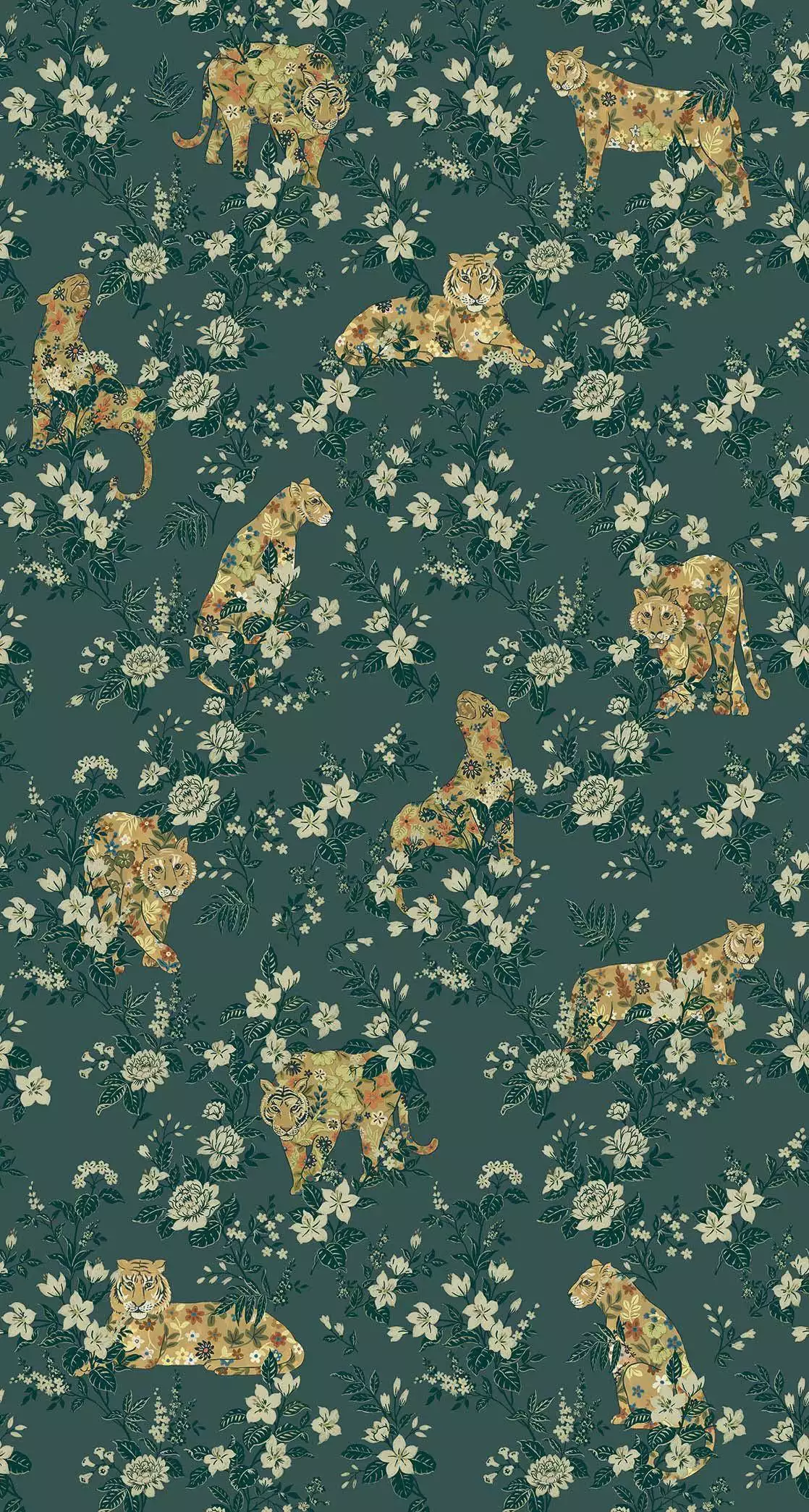 Die "Festival Tiger" Tapete verbindet florale Eleganz mit exotischem Flair. Auf einem tiefen Grün tummeln sich dekorative Tiger und zarte Blumenmuster in warmen Pastelltönen. Das Design wirkt verspielt und luxuriös zugleich und bringt Leben und Charakter in jeden Raum – ein echter Hingucker für moderne und kreative Wohnwelten.
